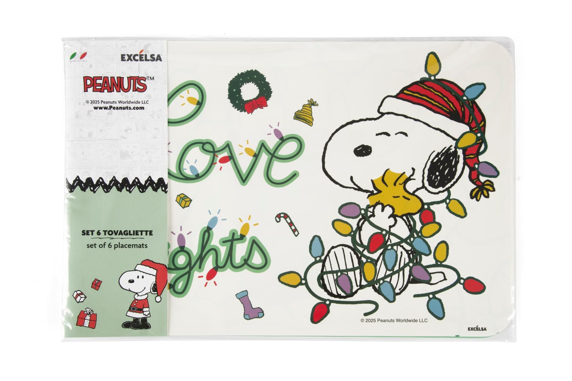 Le tovagliette Peanuts Shiny & Bright di Excélsa sono in materiale plastico pratico da pulire. Il set è composto da 6 tovagliette decorate con Snoopy e Woodstock alle prese con i preparativi per le festività natalizie.