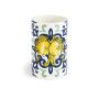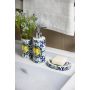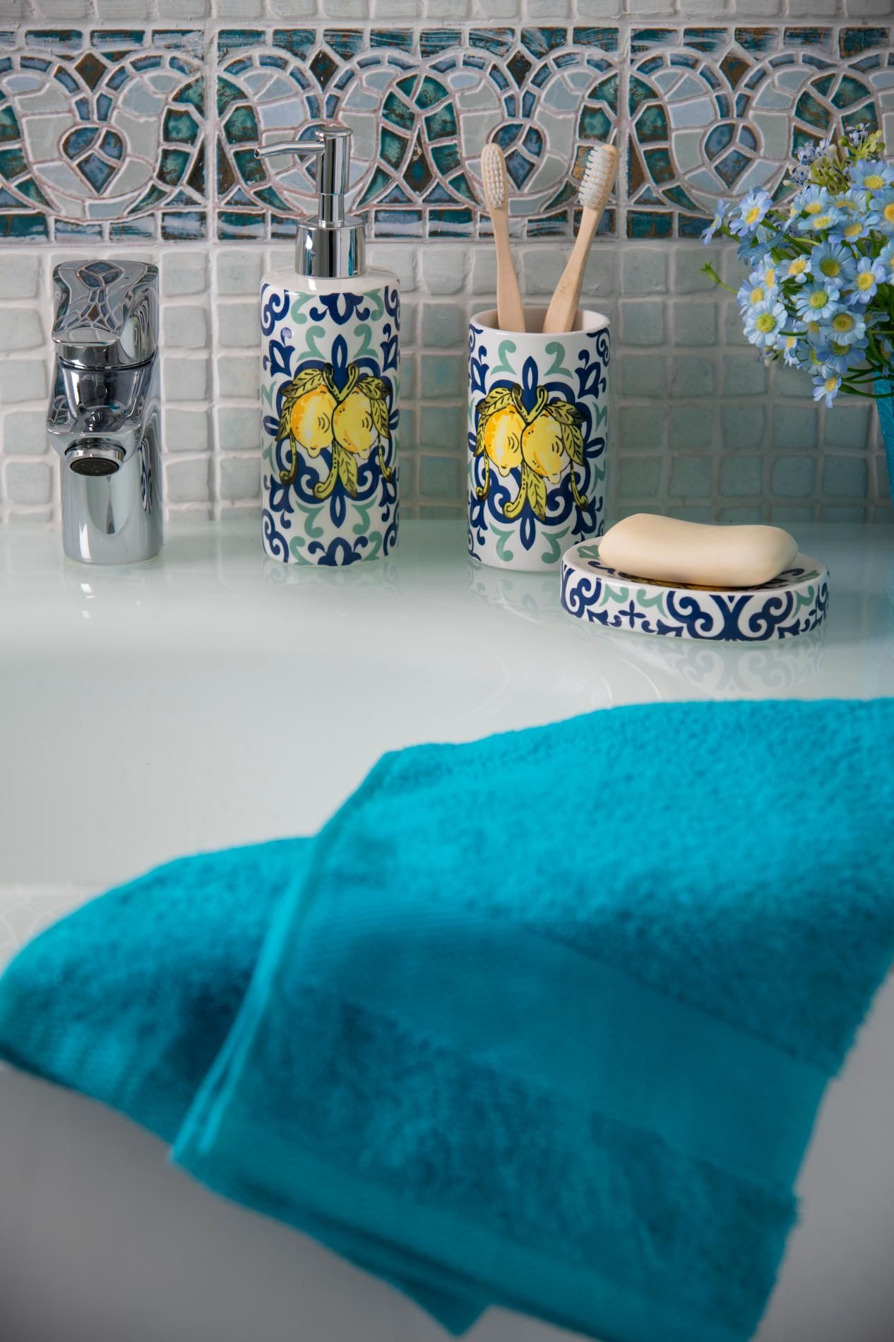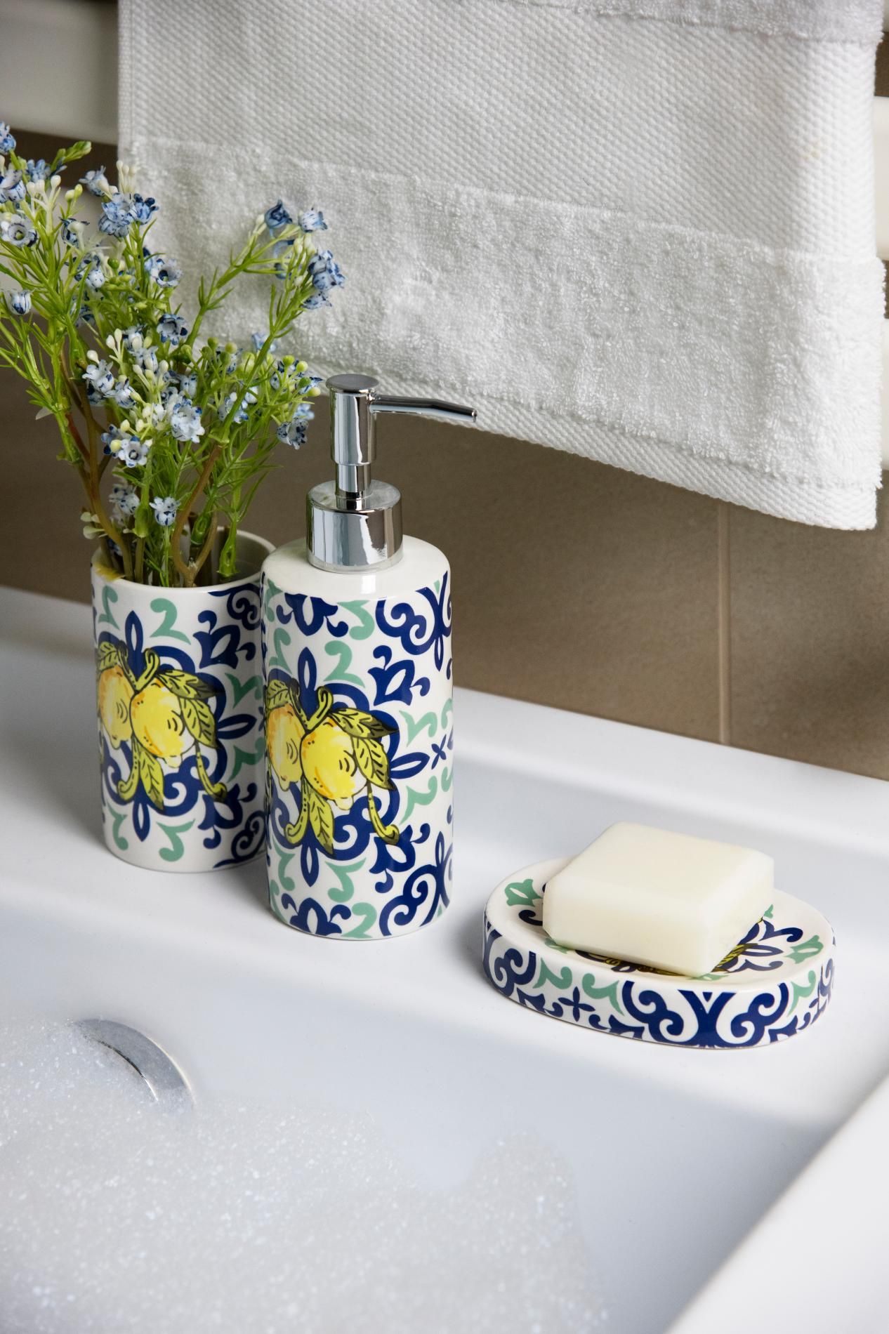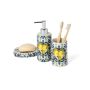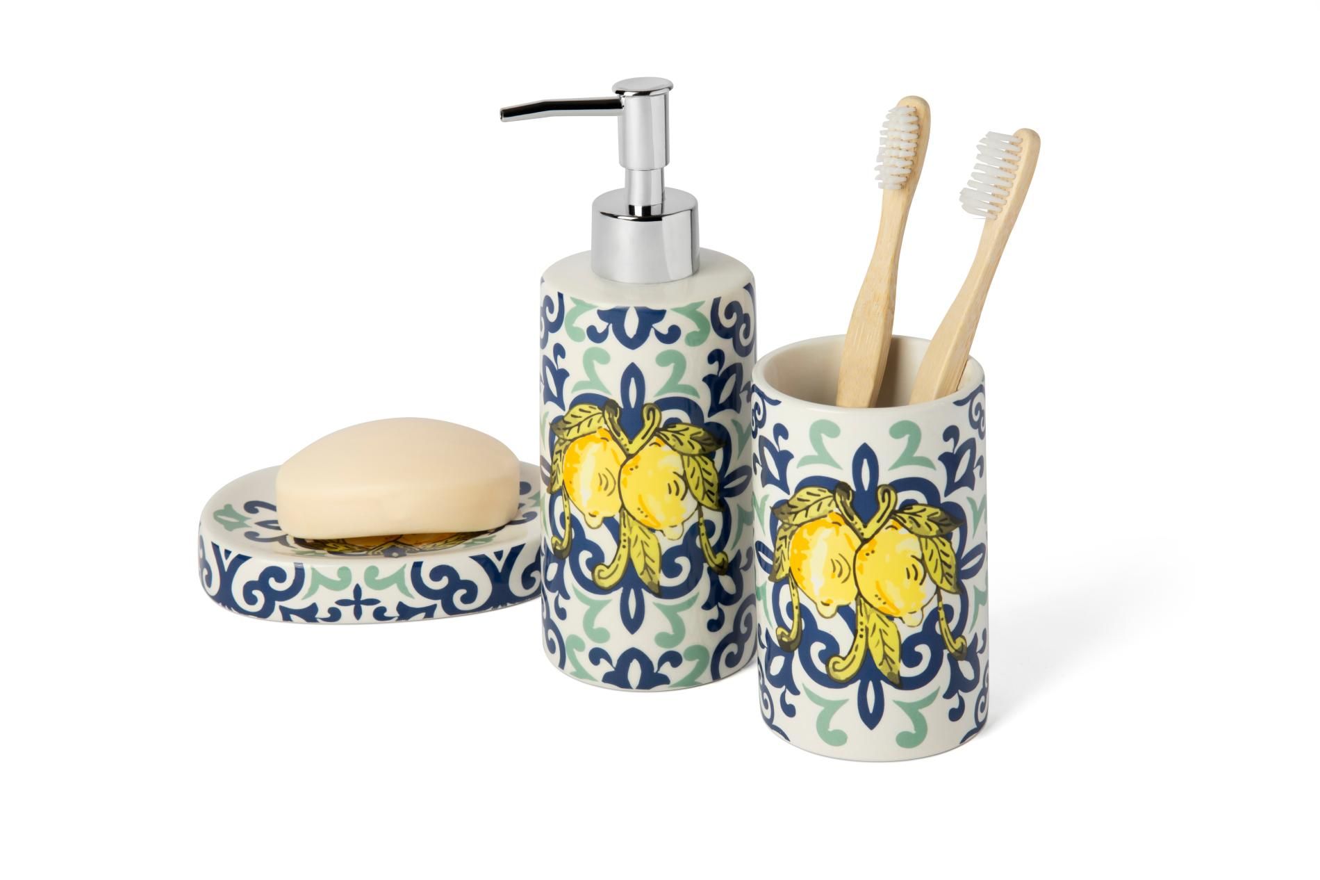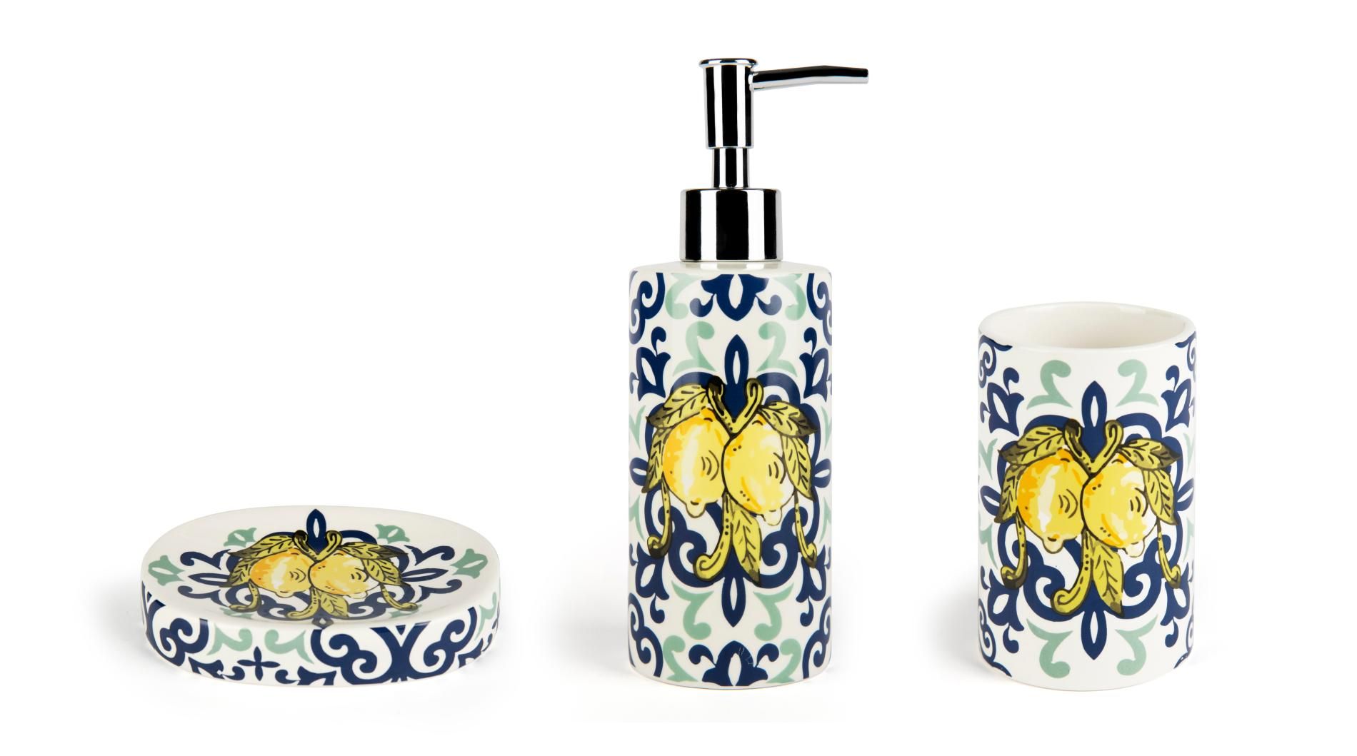 Il set bagno Amalfi di Excélsa si compone di 3 accessori con funzione di porta saponetta, porta spazzolini da denti e porta sapone liquido. Ogni accessorio è finemente decorato con l'omonima fantasia che contraddistingue lo stile Amalfi come mediterraneo e allegro.