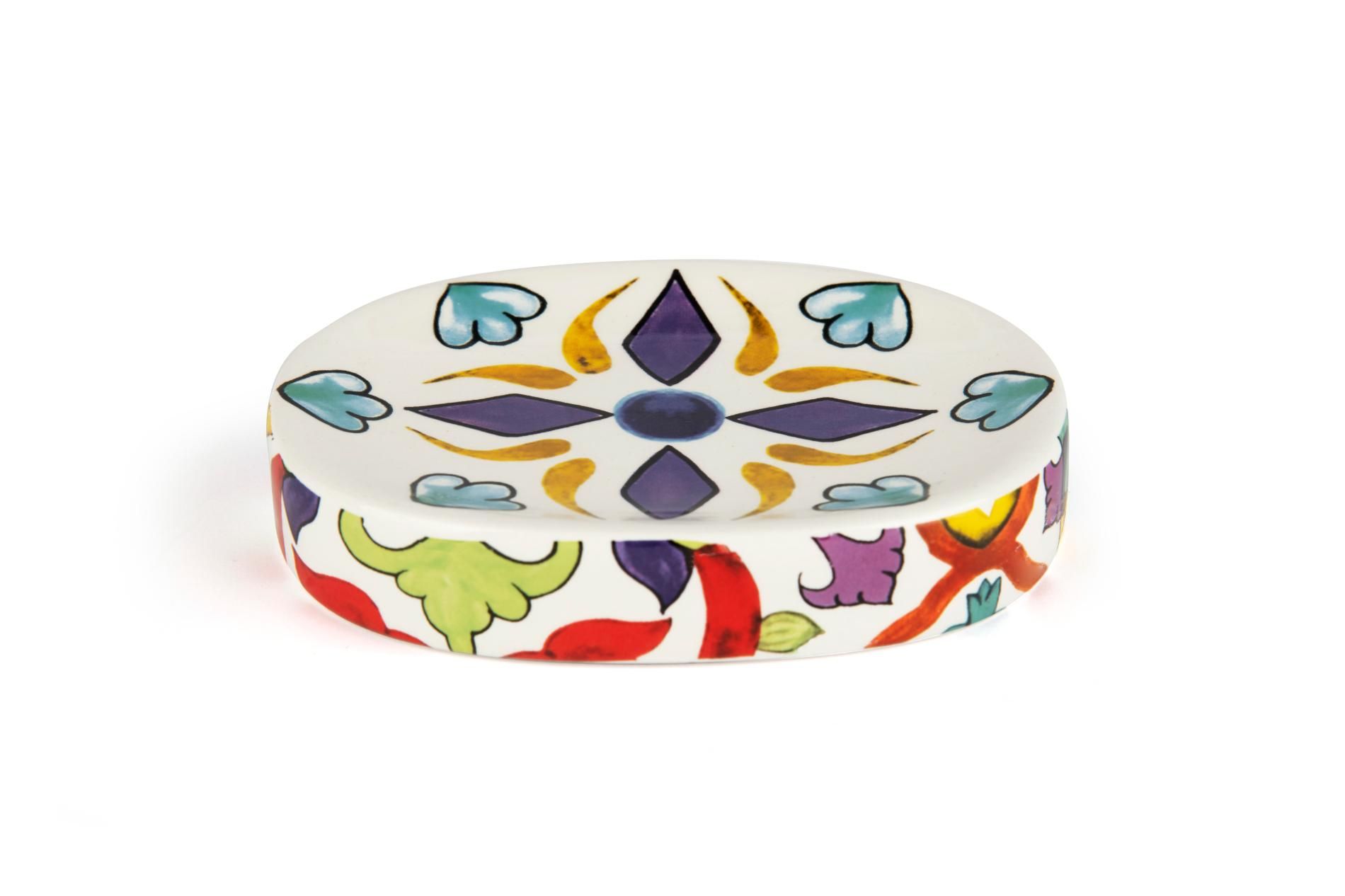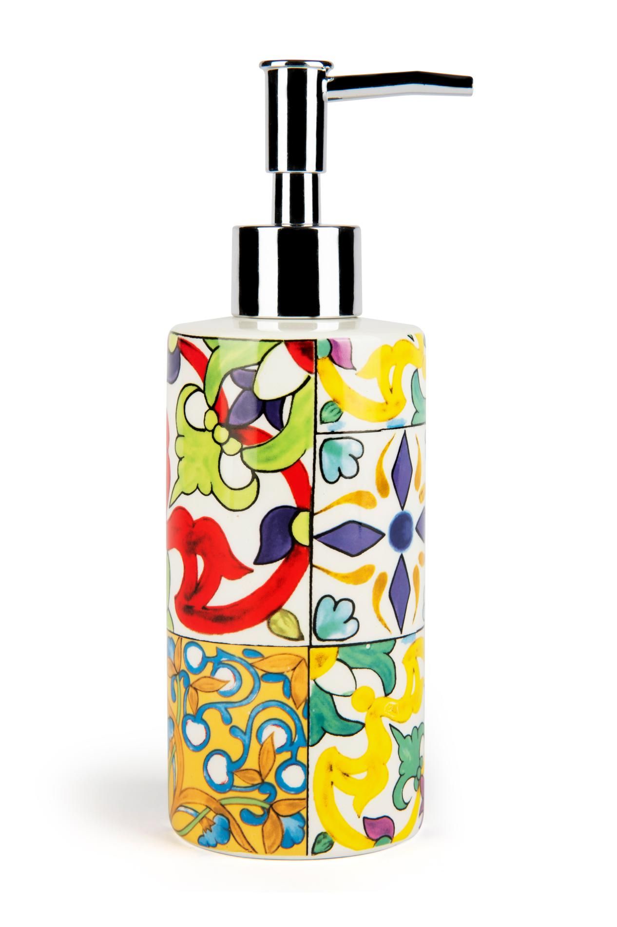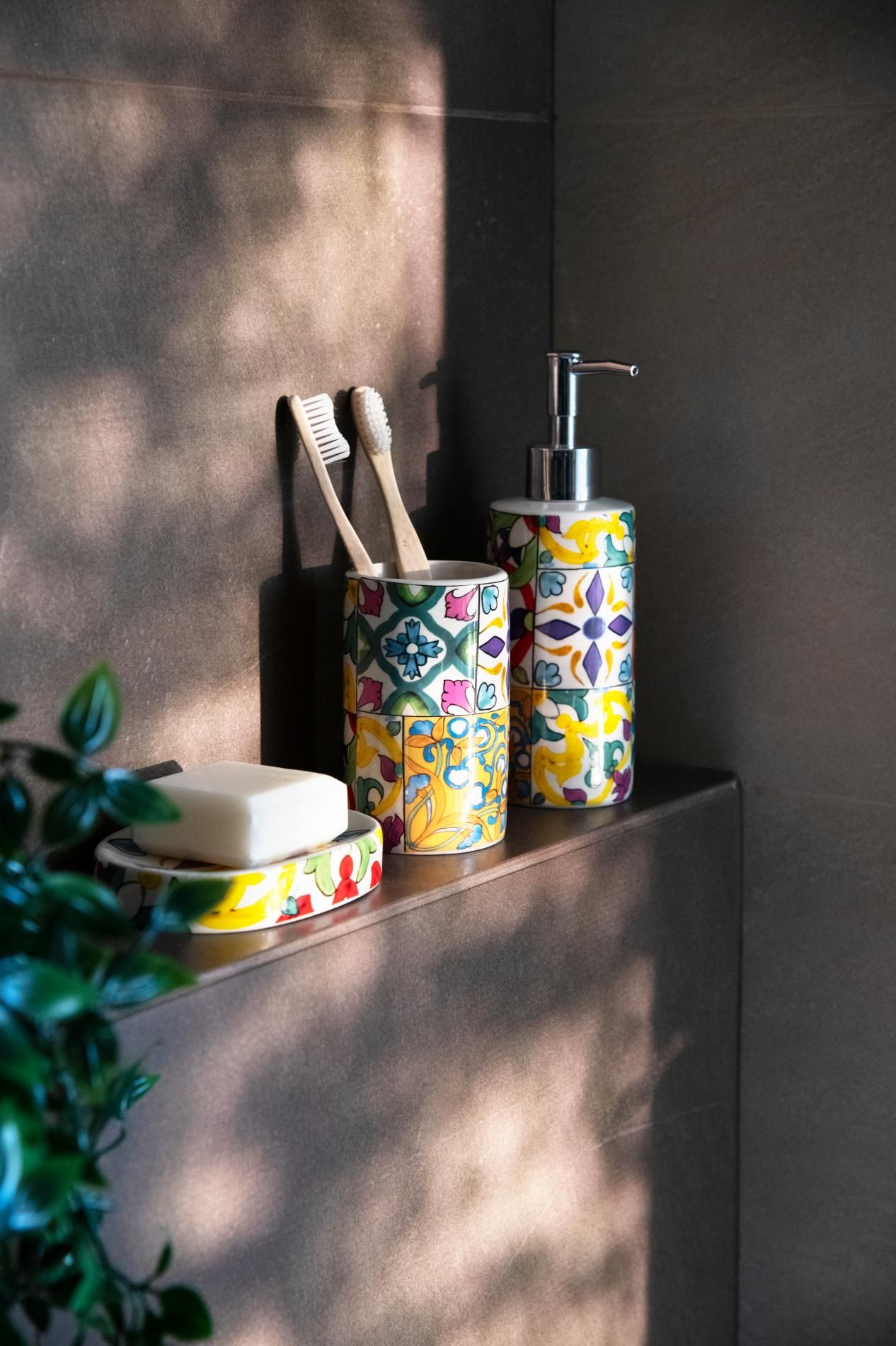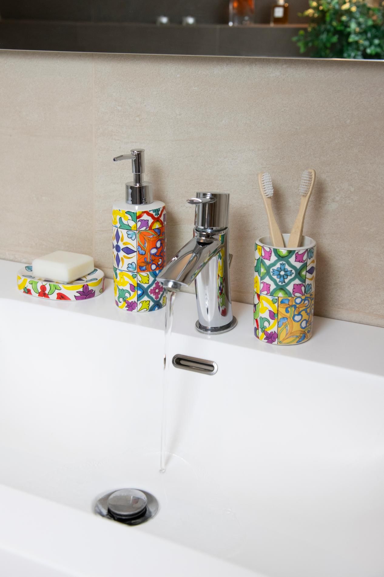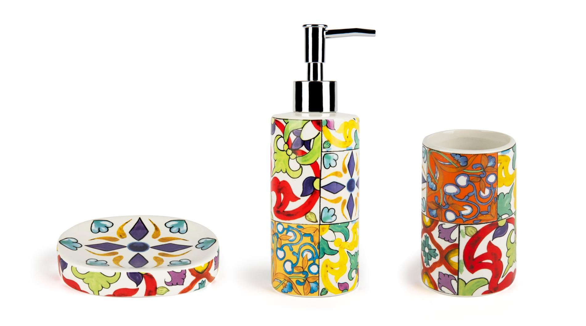 Il set bagno Lisbona di Excélsa si compone di 3 accessori con funzione di porta saponetta, porta spazzolini da denti e porta sapone liquido. Ogni accessorio è finemente decorato con l'omonima fantasia che contraddistingue lo stile Lisbona come mediterraneo e allegro.