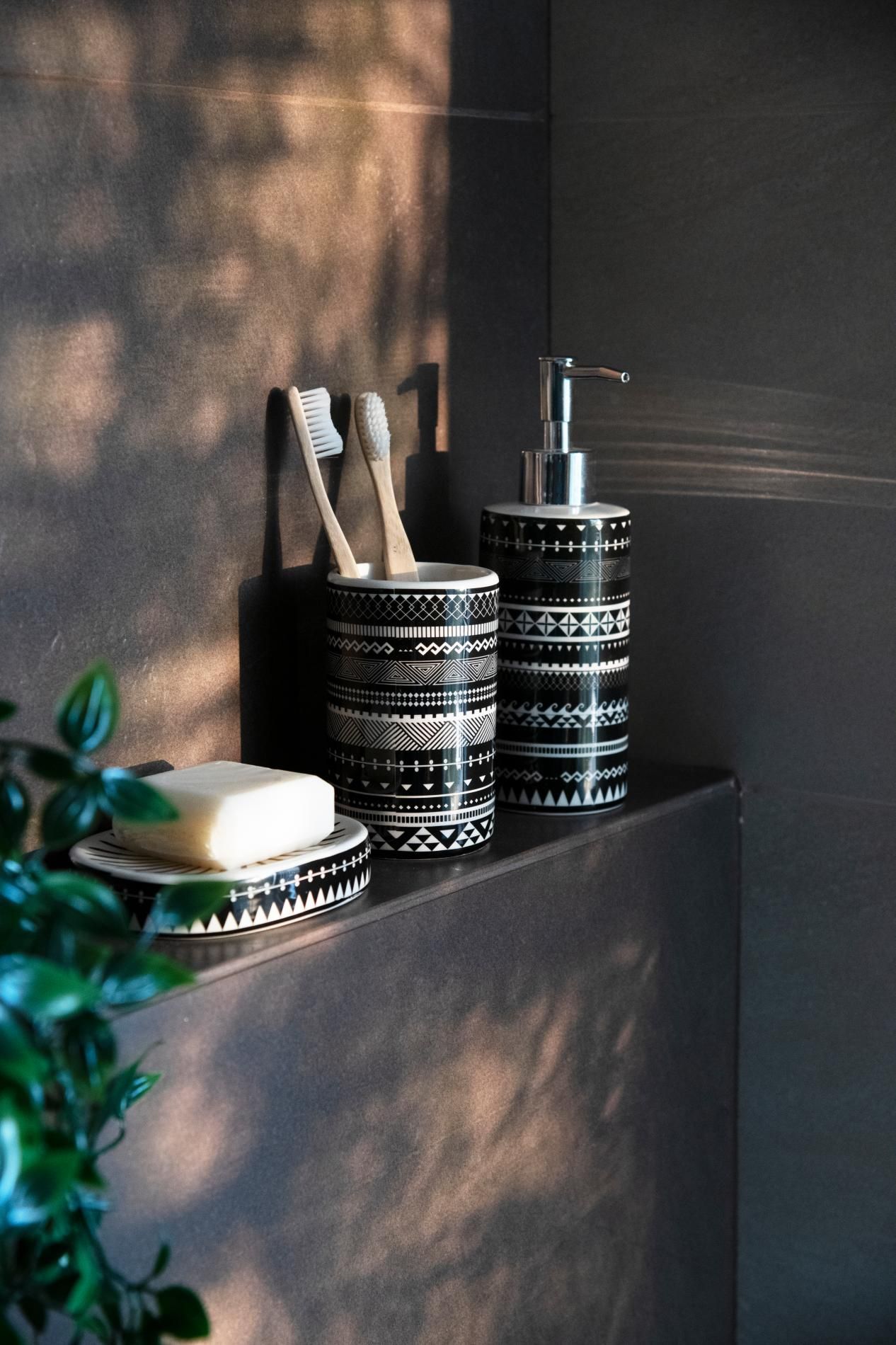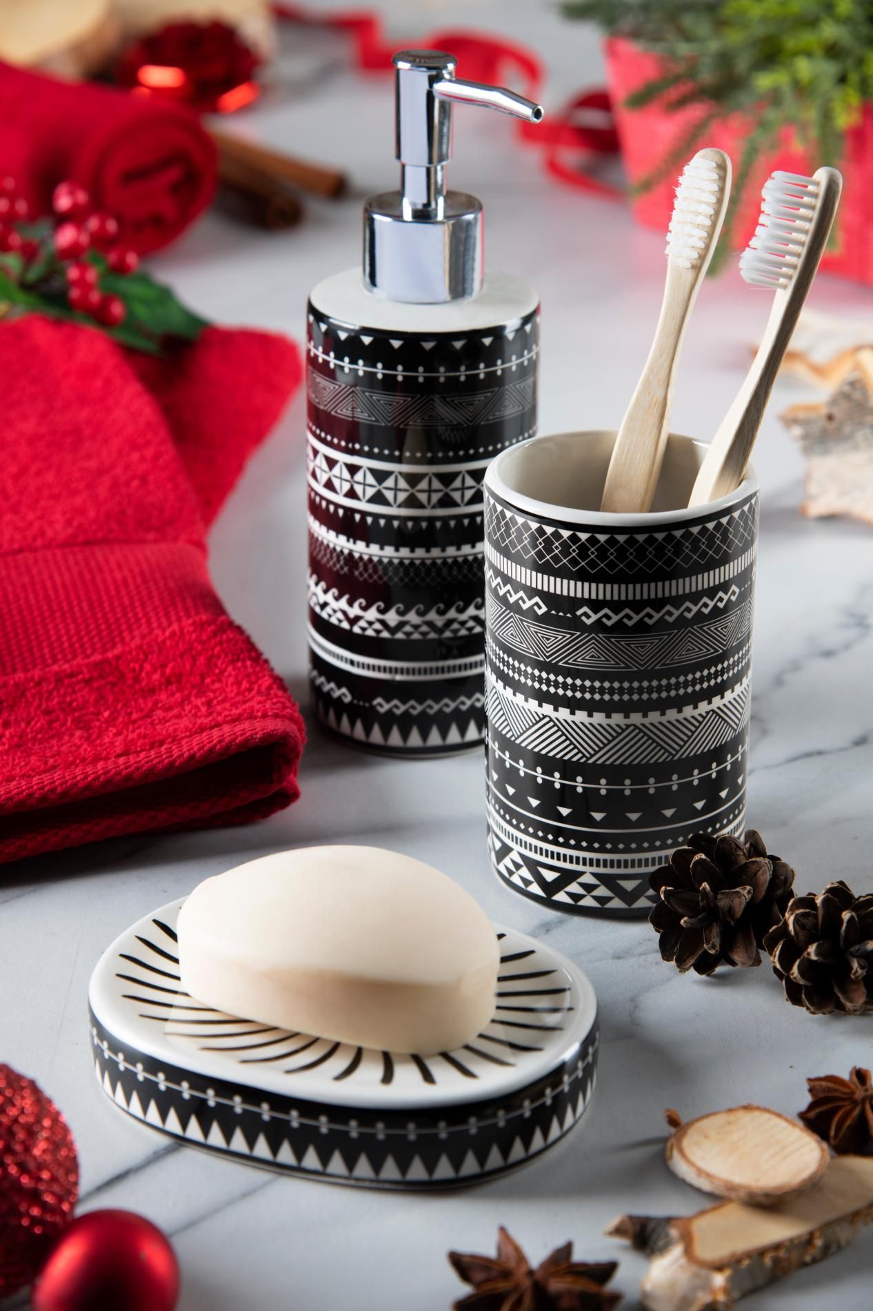 Il set bagno Etnico di Excélsa si compone di 3 accessori con funzione di porta saponetta, porta spazzolini da denti e porta sapone liquido. Ogni accessorio è finemente decorato con l'omonima fantasia che contraddistingue lo stile Etnico come elegante e moderno.