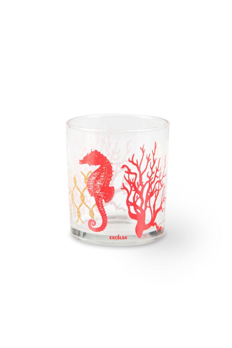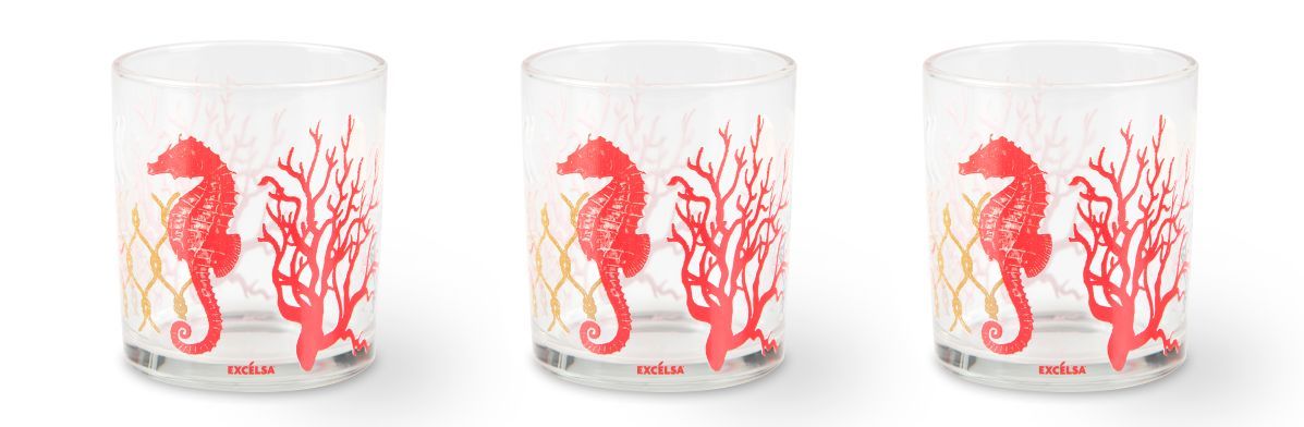 Coral di Excélsa è il set da 3 pezzi di bicchieri acqua, in vetro trasparente, con decorazioni che rappresentano conchiglie e coralli colorati.