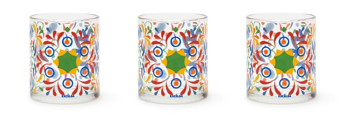 Ogni bicchiere è personalizzato con una decorazione multicolore stile messicano che riprende anche gli altri prodotti dell'omonima collezione.