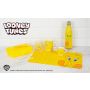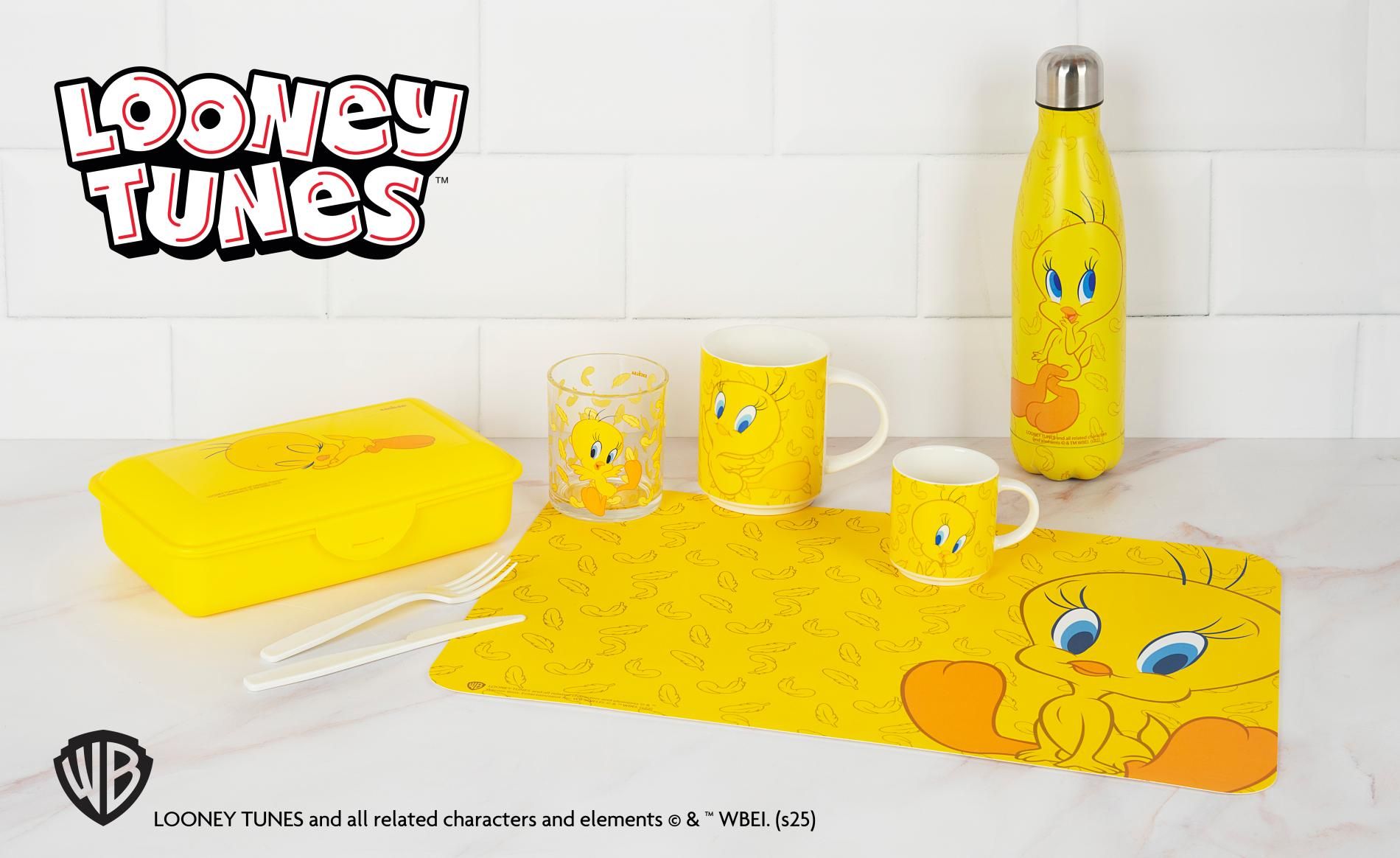 Ogni bicchiere ha la personalizzazione con il personaggio di Titti e può essere abbinato con gli altri prodotti decorati sempre con il canarino giallo oppure con Gatto Silvestro.