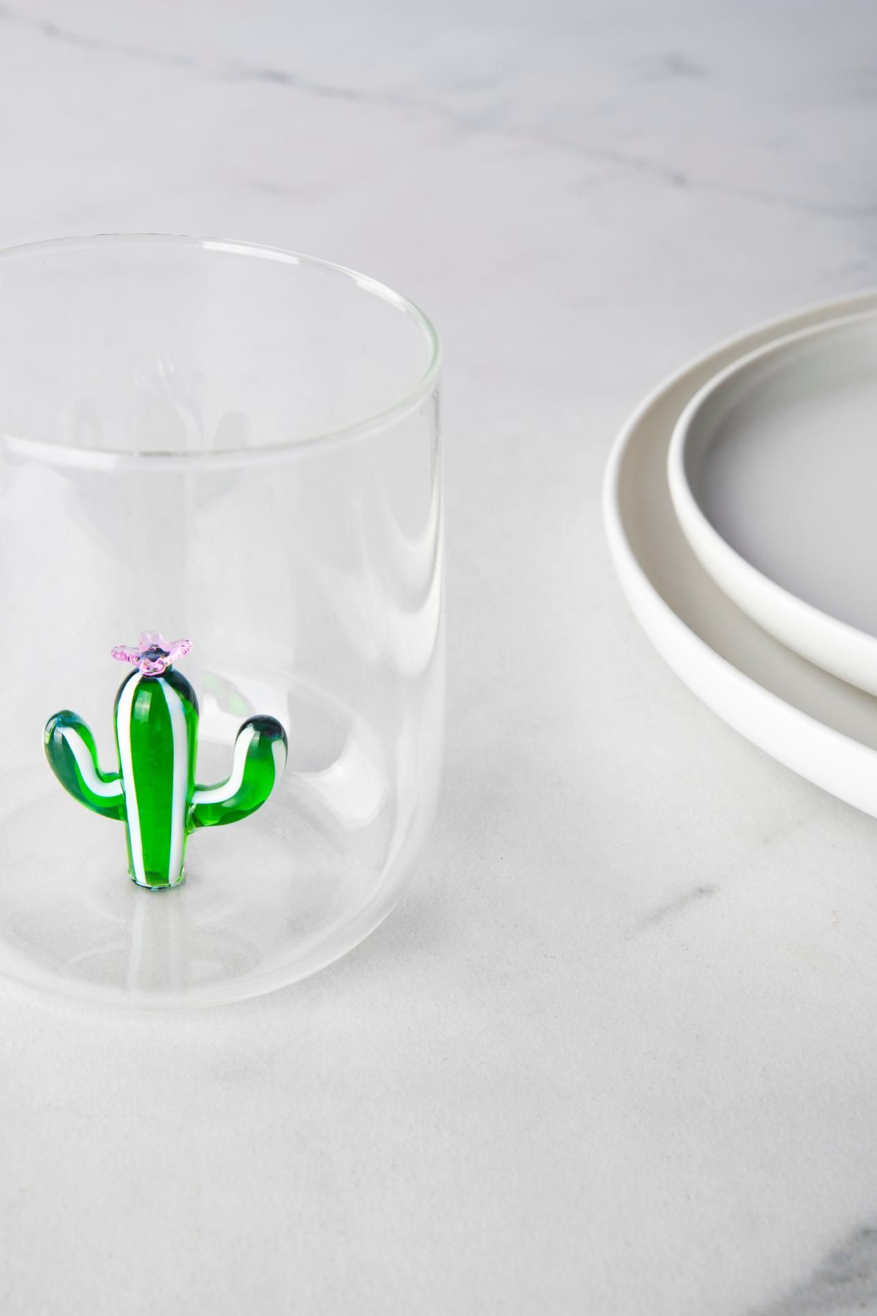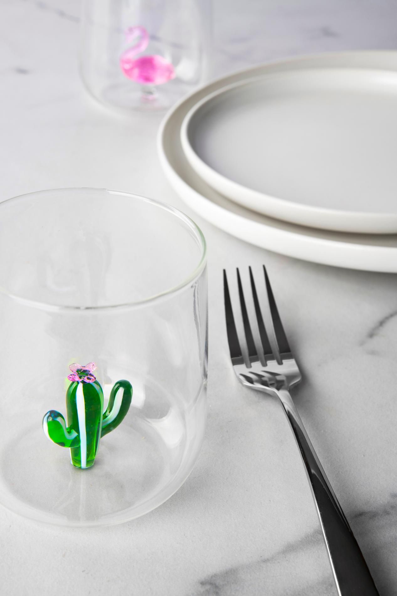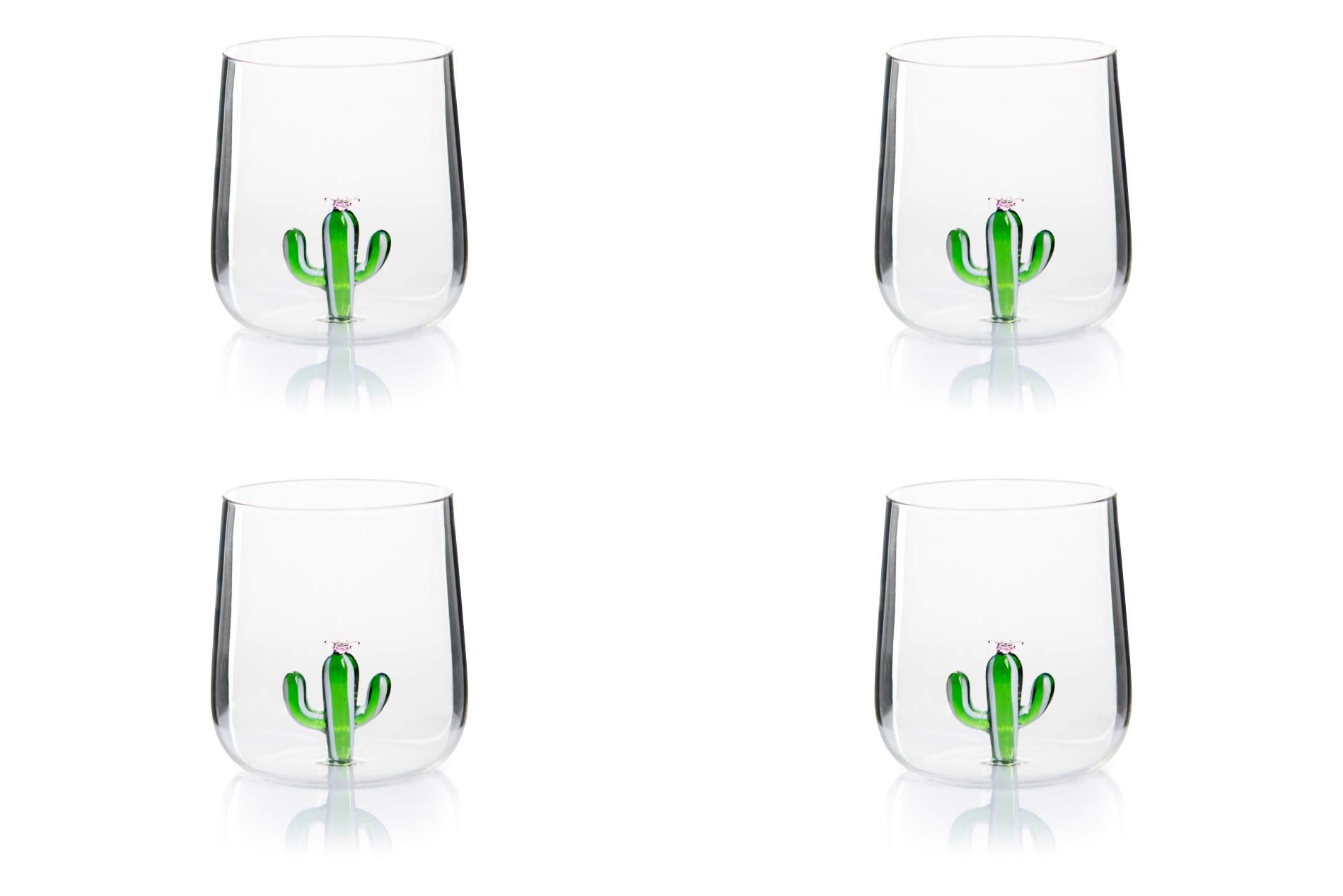 Inside di Excélsa è il set da 4 bicchieri acqua in vetro borosilicato trasparente con personaggio cactus verde, tridimensionale posto all'interno del bicchiere stesso.