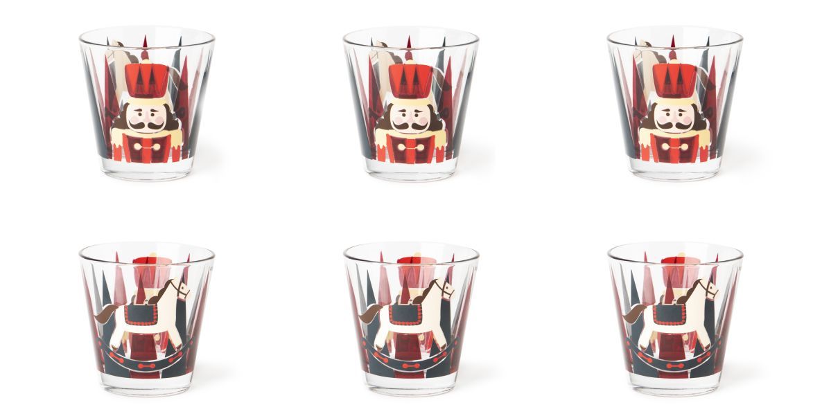 I bicchieri acqua Vintage Christmas sono venduti in set da 6 pezzi. Ogni bicchiere è decorato a 360 gradi con la fantasia e i personaggi dell'omonima collezione. Il soldatino schiaccianoci e il cavallino a dondolo sono rivisitati in chiave moderna per mantenere quella nota retrò, ma attuale.