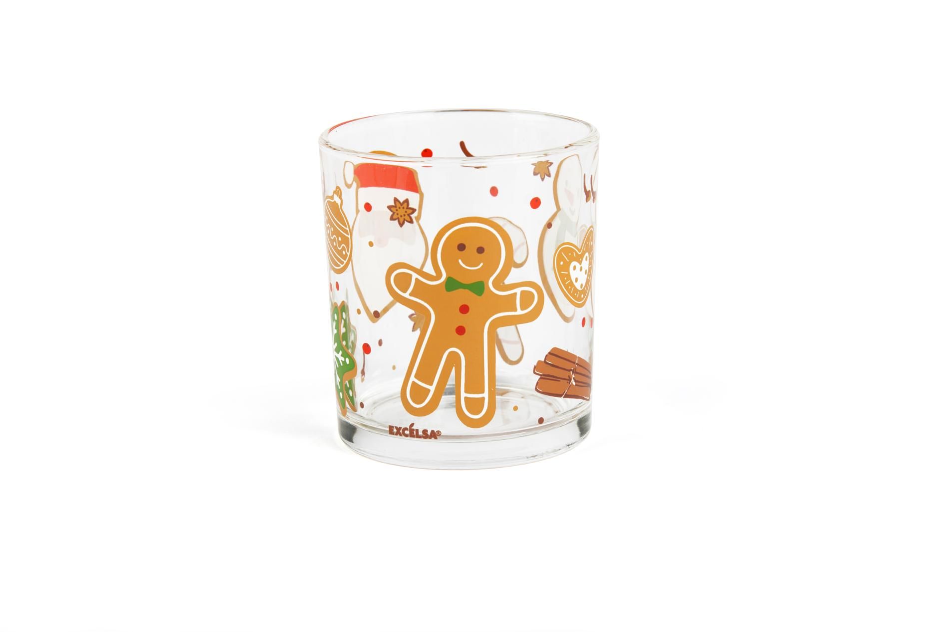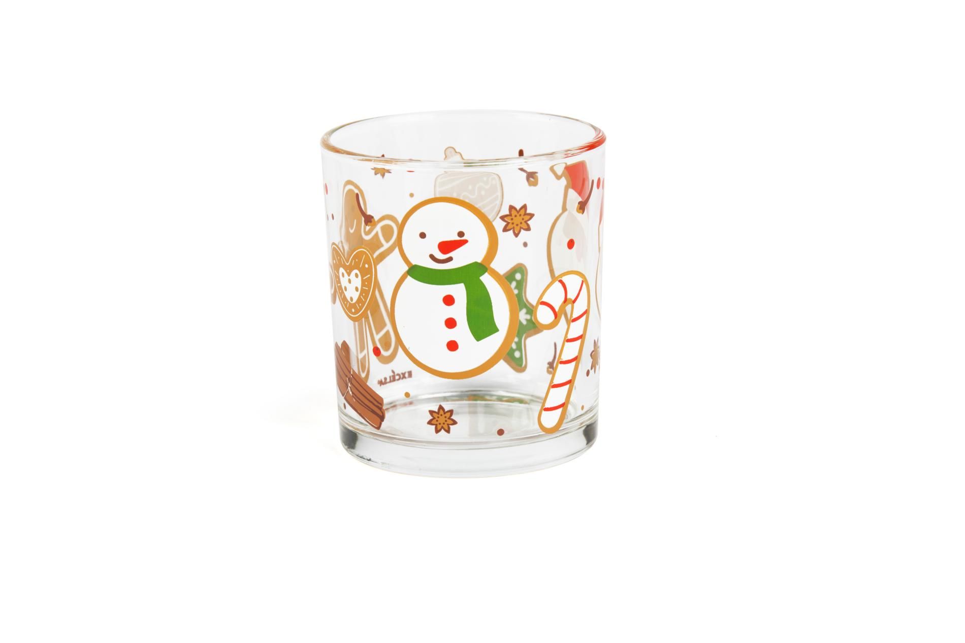La decorazione del bicchiere riprende alcuni classici personaggi e oggetti del periodo natalizio come il biscottino di zenzero, il pupazzo di neve e il bastoncino caramella di zucchero.