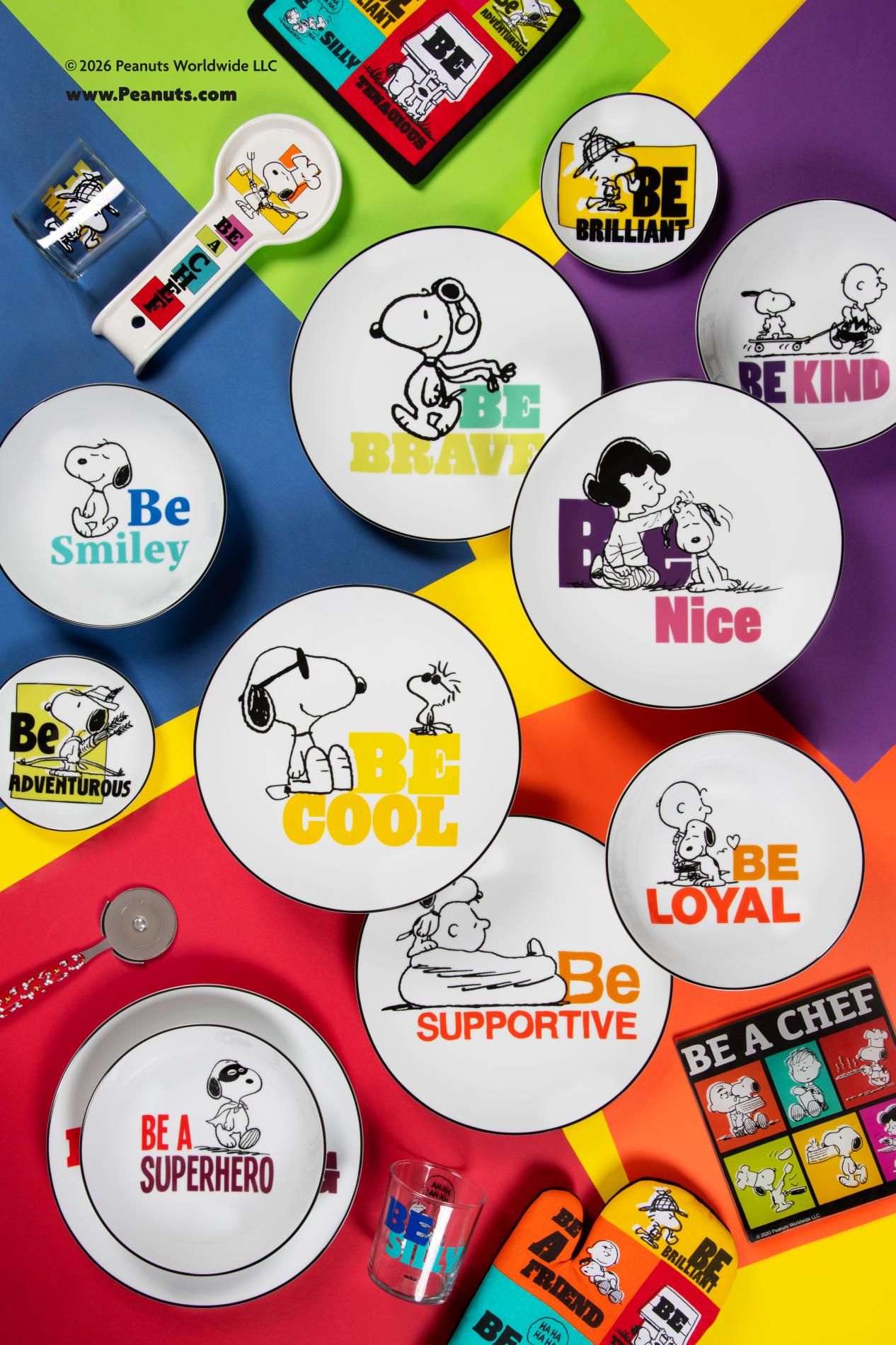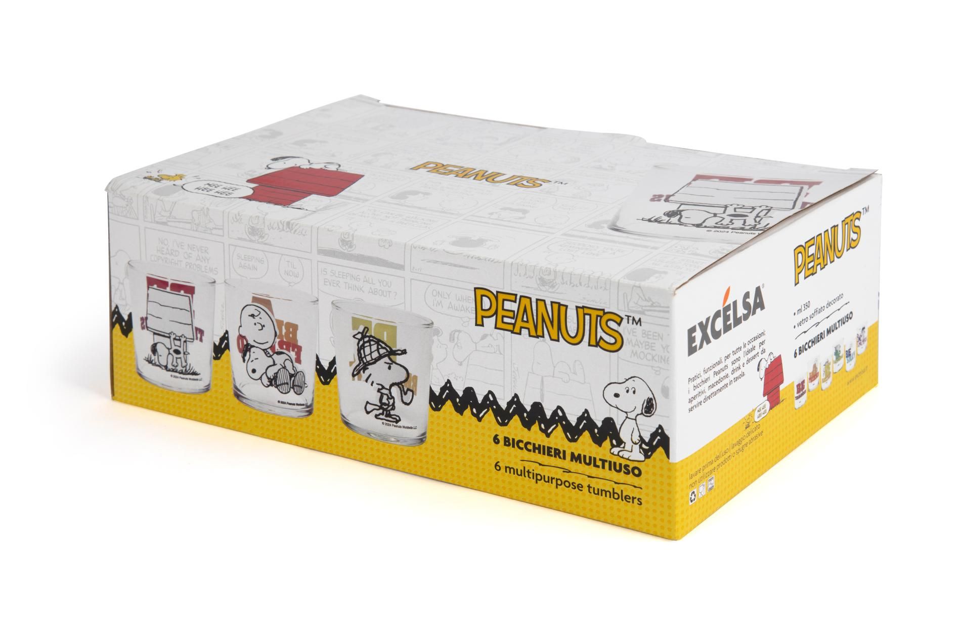 Peanuts di Excélsa è il set da 6 pezzi di bicchieri acqua in vetro trasparente con decorazioni a tema. Snoopy e la gang di amici storici decorano ogni bicchiere con una frase motivazionale.