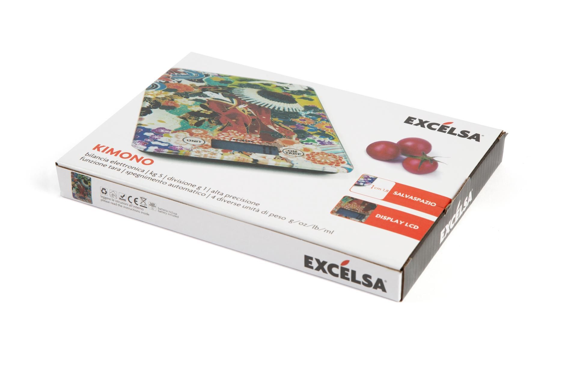 La bilancia da cucina elettronica Kimono di Excélsa ha la parte superiore in vetro decorato e la parte sottostante/struttura in ABS.