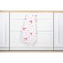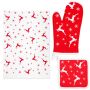 La confezione include anche una presina e un guanto forno (entrambi con trapuntatura su un lato) in coordinato con il canovaccio fronte fantasia e retro tinta unita.