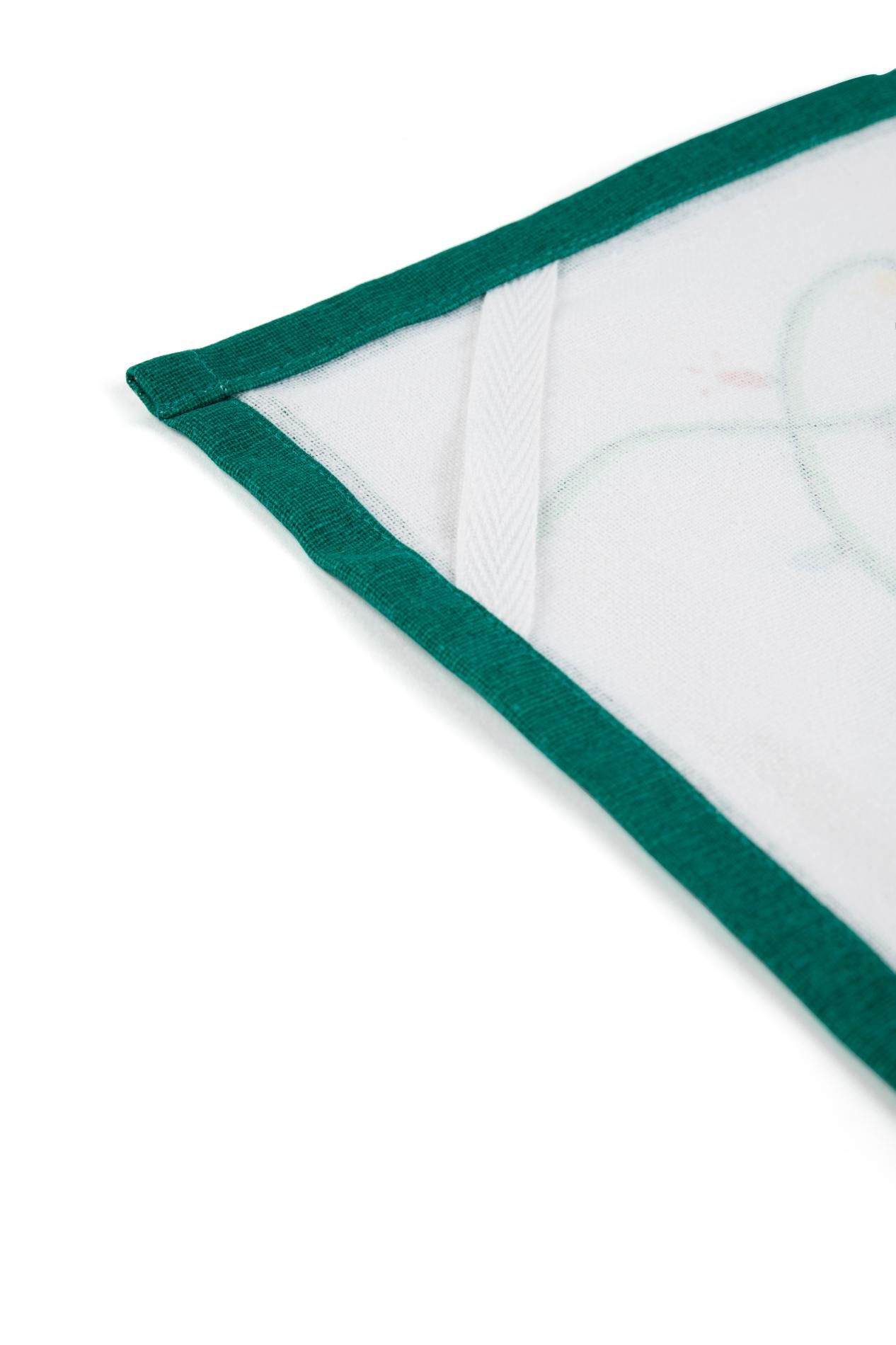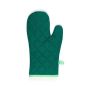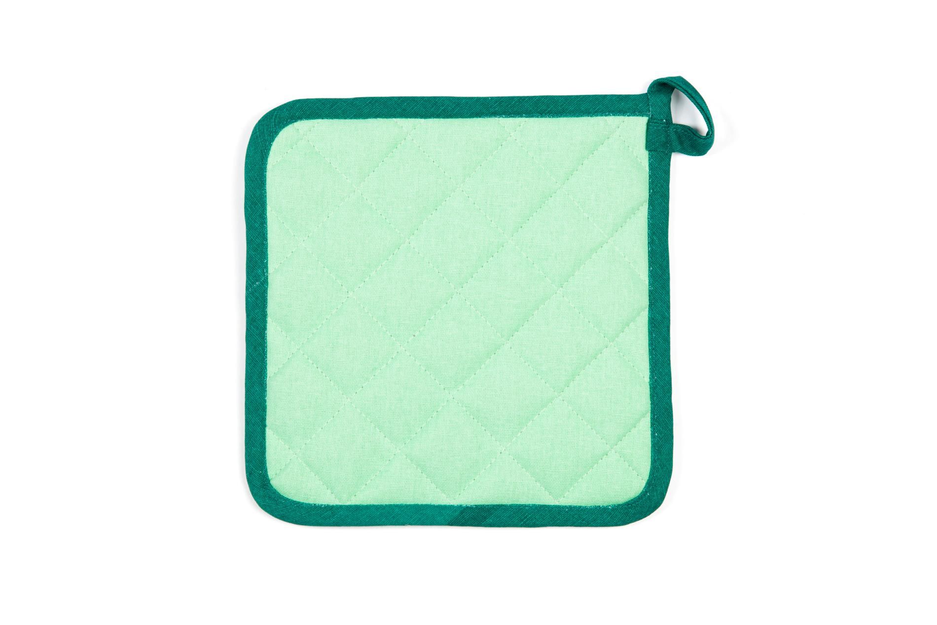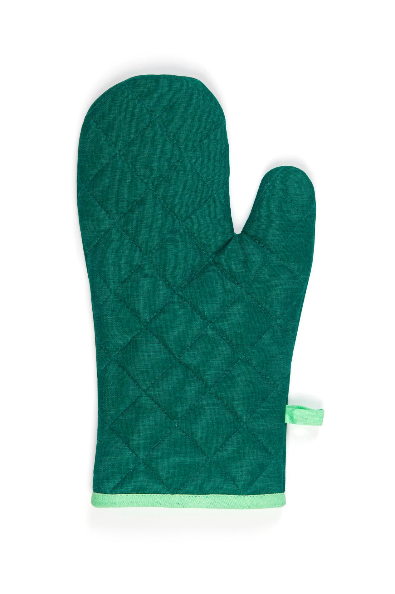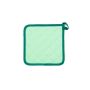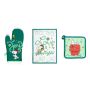 La confezione include anche una presina e un guanto forno (entrambi con trapuntatura su un lato) in coordinato con il canovaccio fronte fantasia e retro tinta unita.