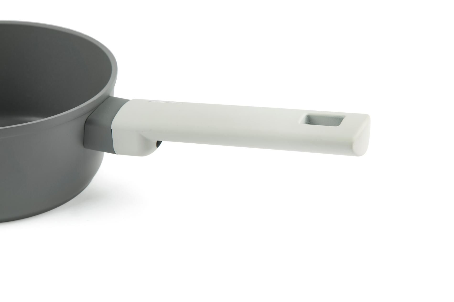 Nordic Grey di Excélsa è la casseruola in alluminio forgiato con rivestimento antiaderente PFAS free. Il suo manico garatisce una presa solida e sicura grazie all'effetto "soft touch". Il fondo è ideale per induzione full ma anche per fornello a gas tradizionale.