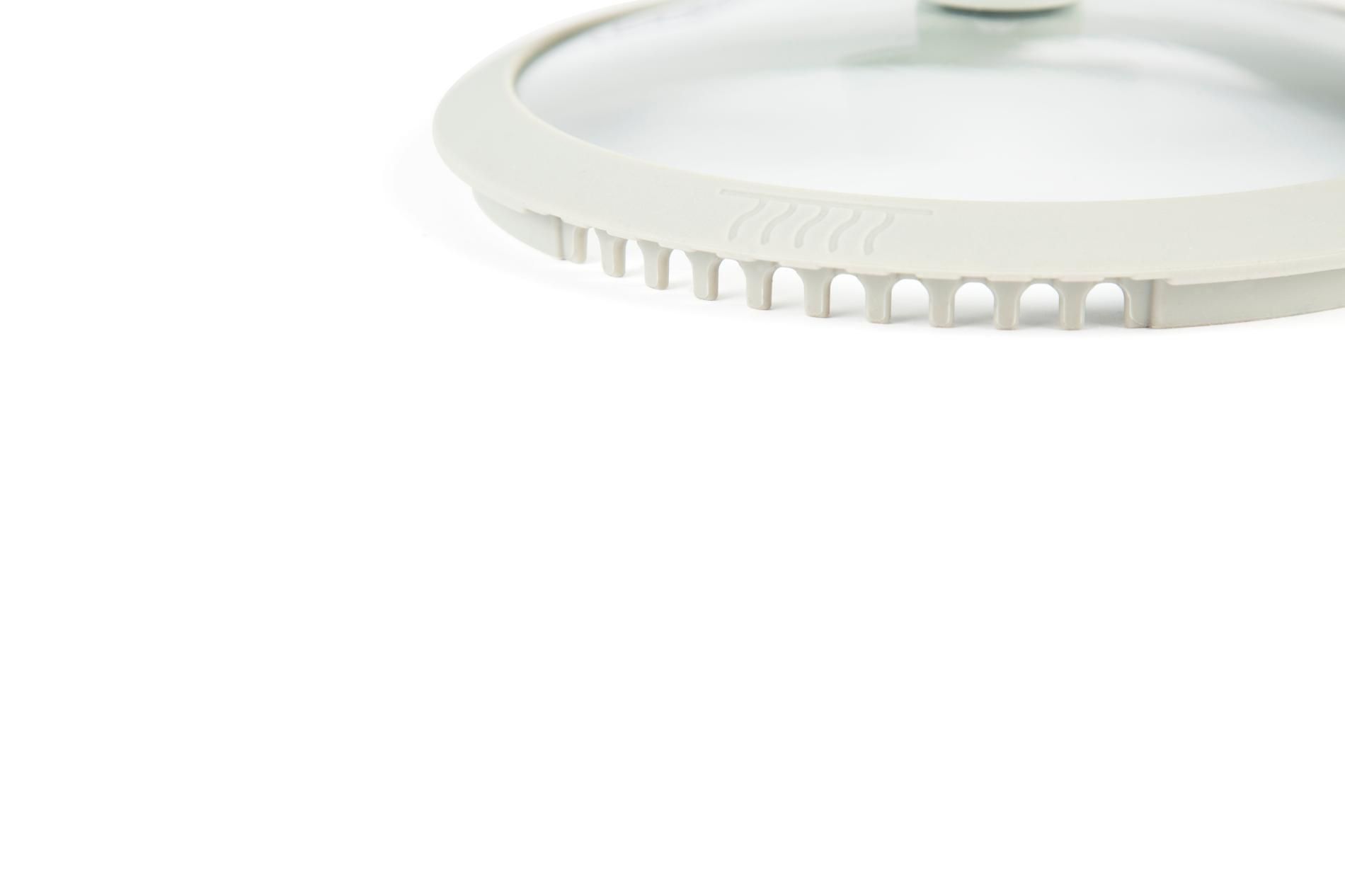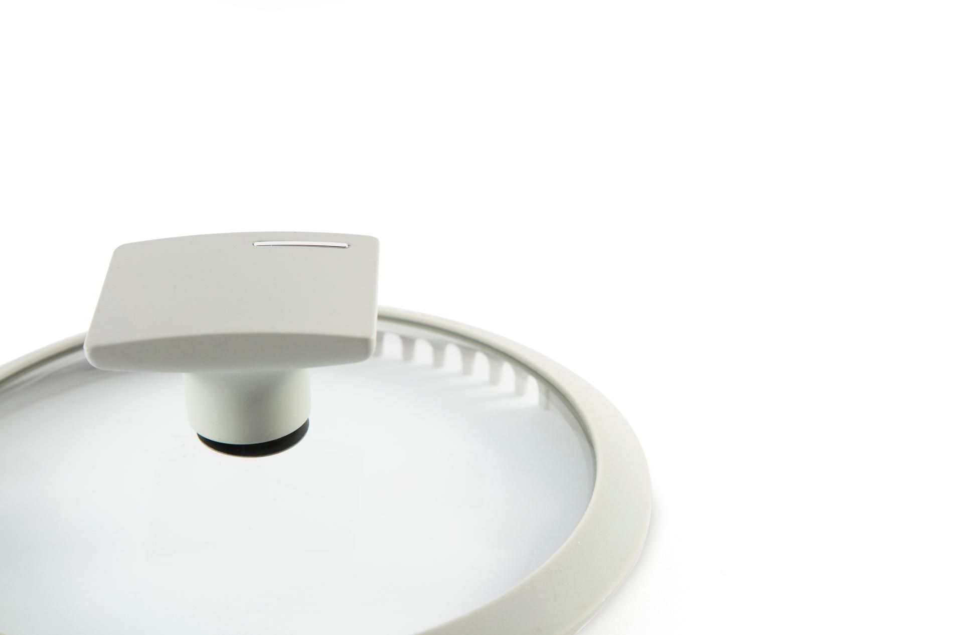 Diametro: 16 cm, provvista di coperchio in vetro dotato di sistemi di sfiato del vapore e gocciolatoio per i liquidi. Il coperchio ha il pomolo in bakelite che permette una presa sicura al riparo dalla dispersione del calore.