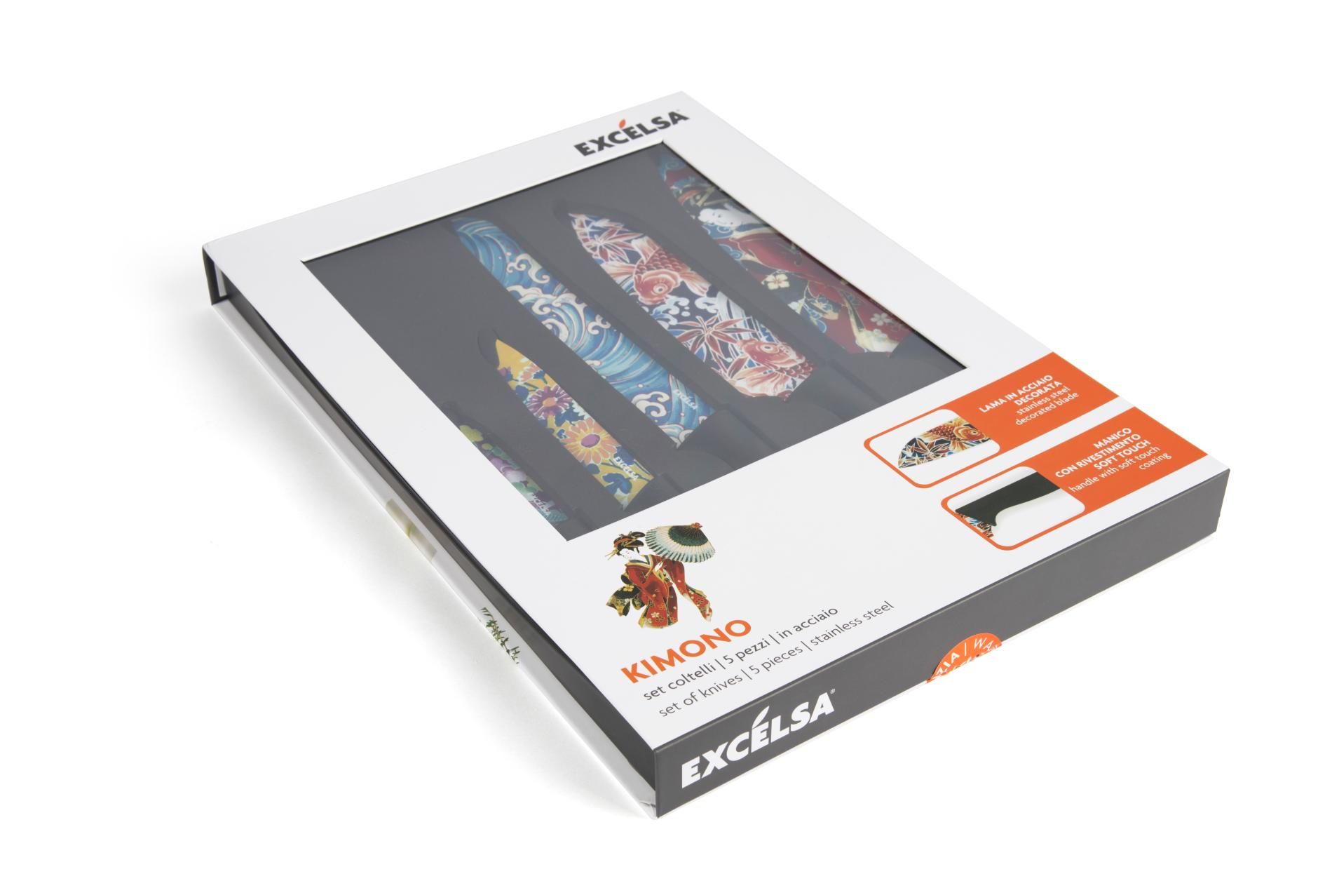 Il set da 5 coltelli Kimono di Excélsa è ideale per chi vuole tagliare bene con stile e modernità. Le lame di ogni coltello infatti sono decorate in maniera diversa con una porzione di fantasia orientale che caratterizza lo stile Kimono.