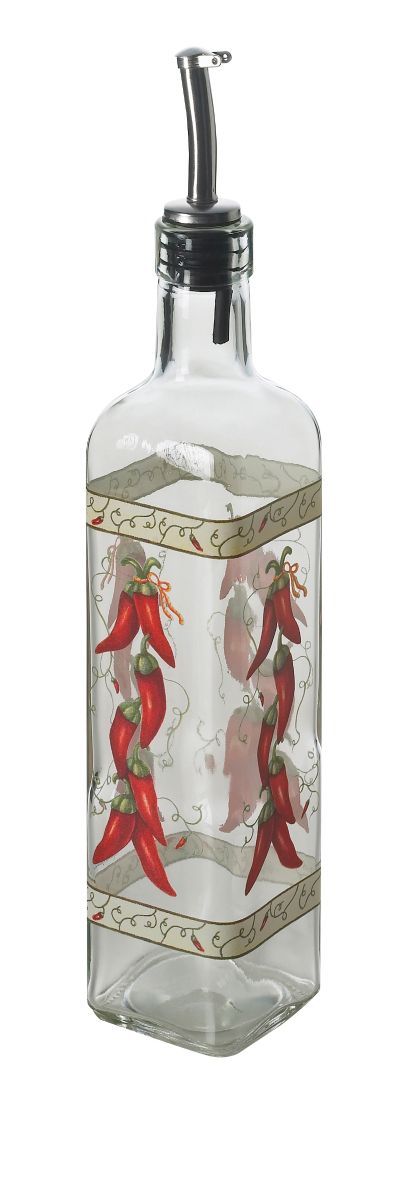 L'oliera Peperoncino è in vetro decorato con fantasia mediterranea, può contenere circa 470 ml di olio e il corpo può essere lavato in lavastoviglie.