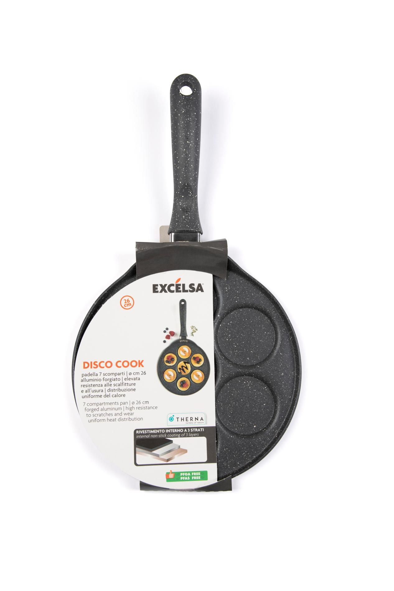 Disco Cook è la collezione di pentole e piastre tra cui la Padella 7 Scomparti, 26 cm di diametro con 1 manico.