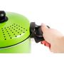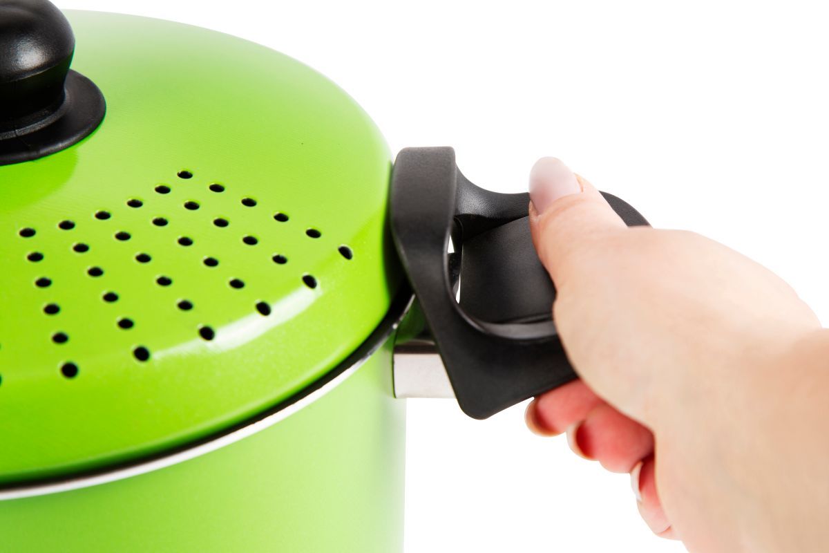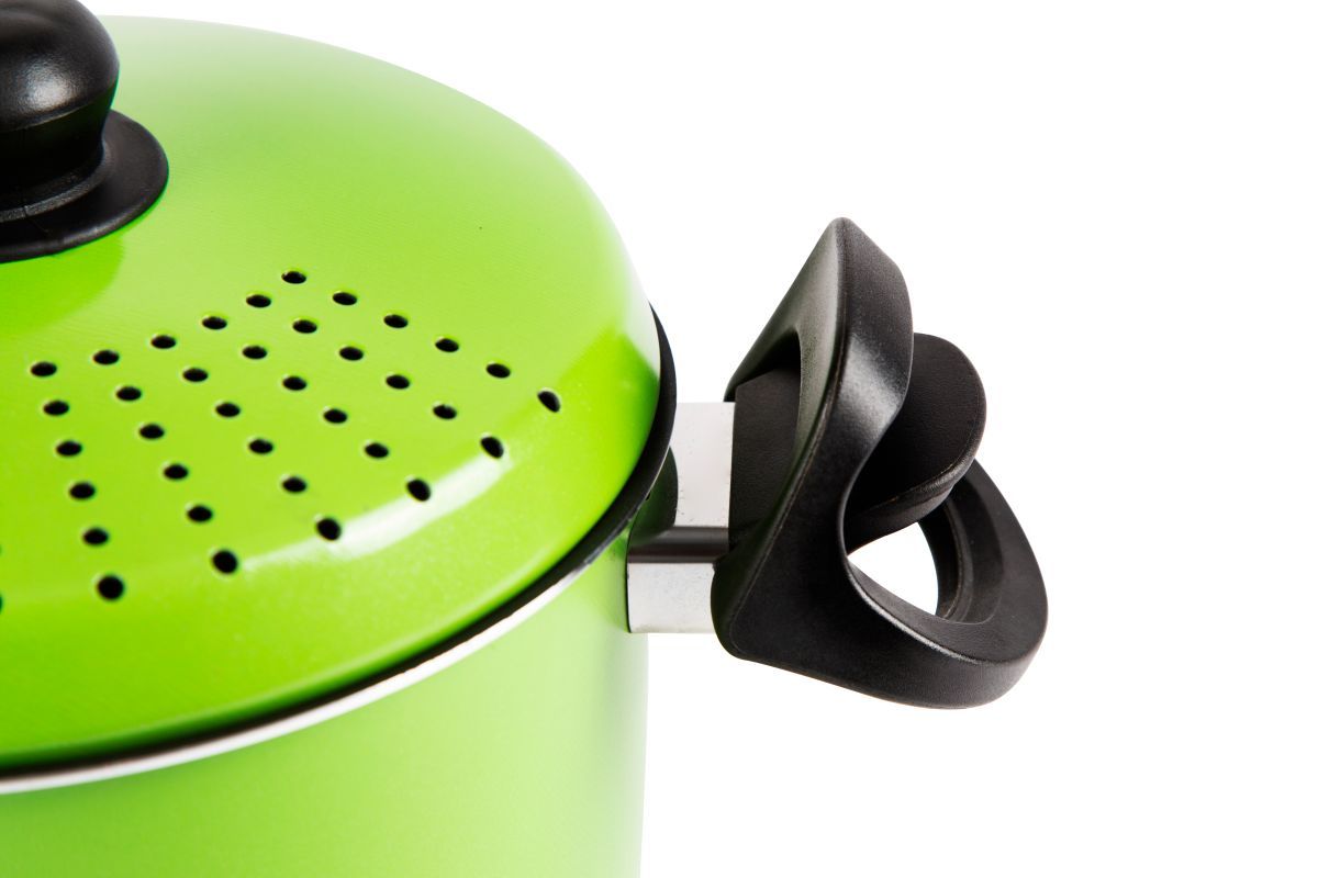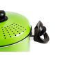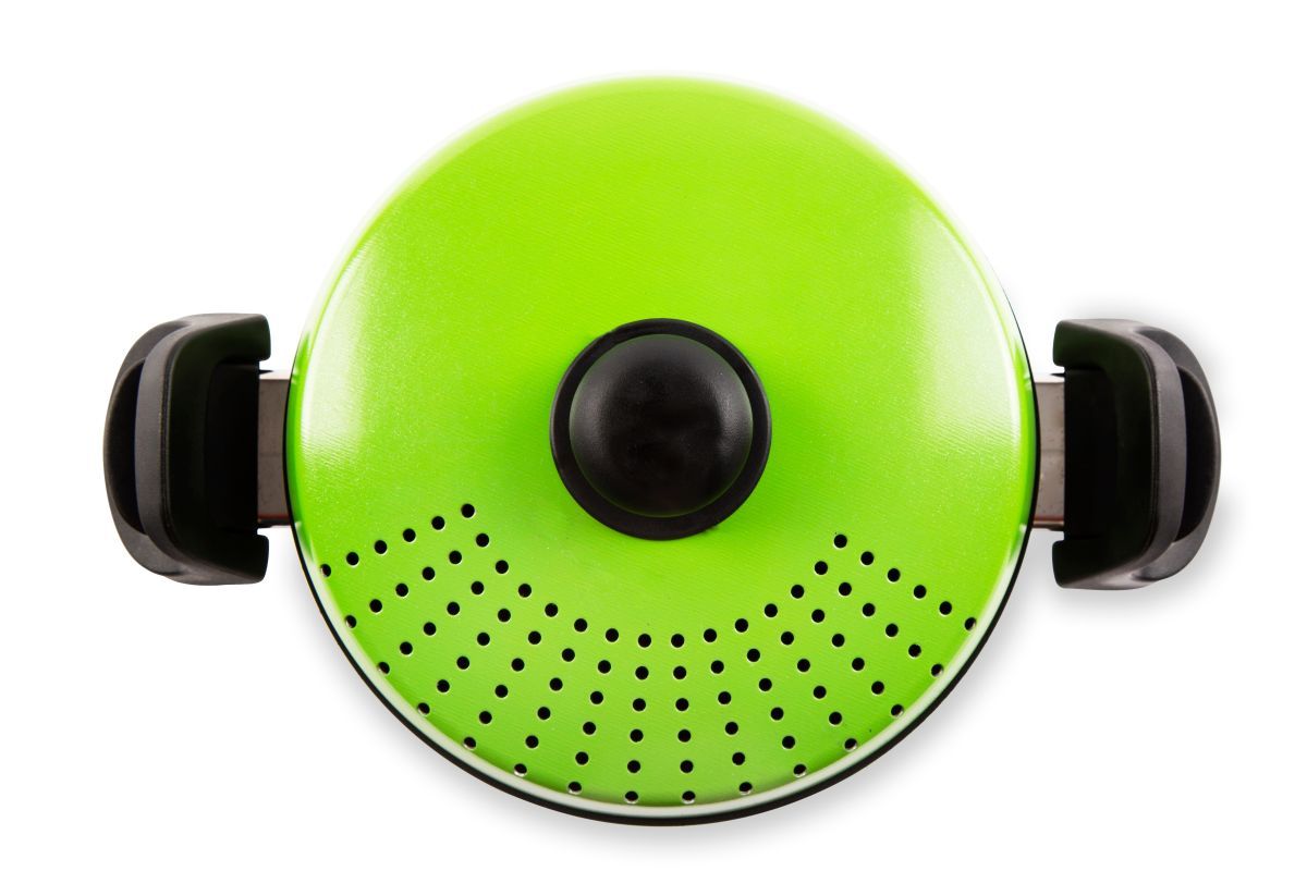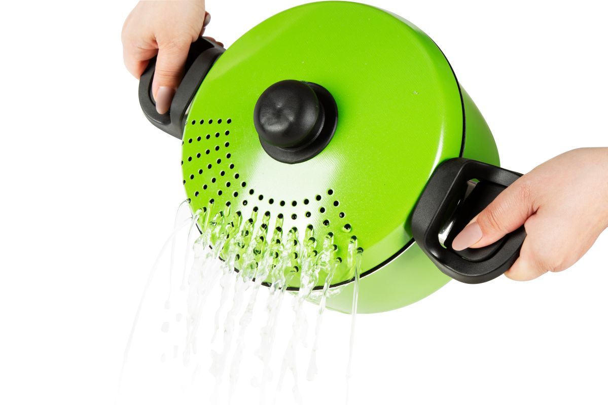 Grazie al coperchio forato e alla maniglia brevettata l'acqua di bollitura può essere eliminata in un semplice gesto, senza avere la necessità di uno scolapasta aggiuntivo.