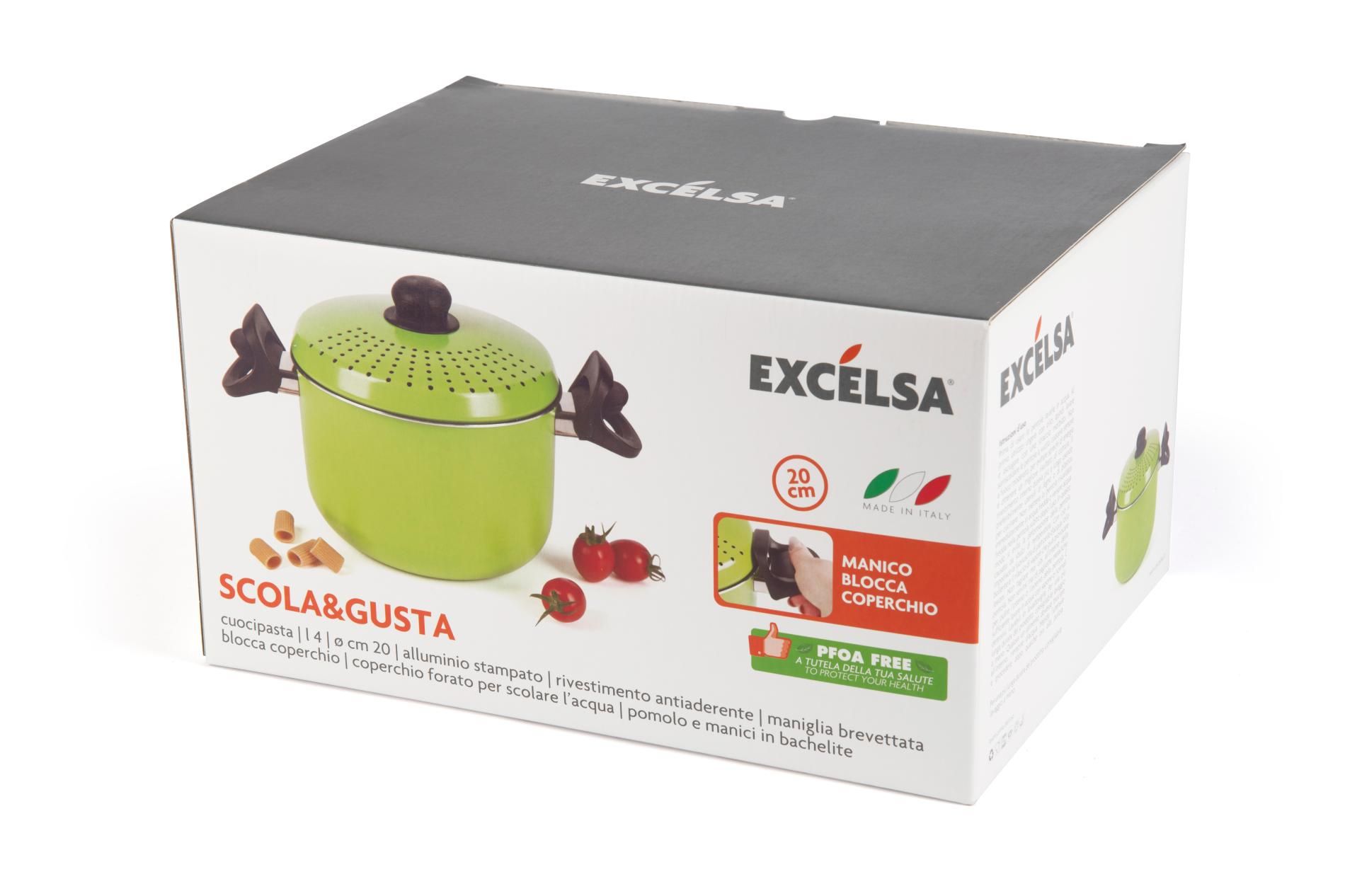 Scola&Gusta di Excélsa è la pentola cuocipasta da 4 litri che permette di cucinare e scolare pasta e verdure in modo pratico e sicuro.