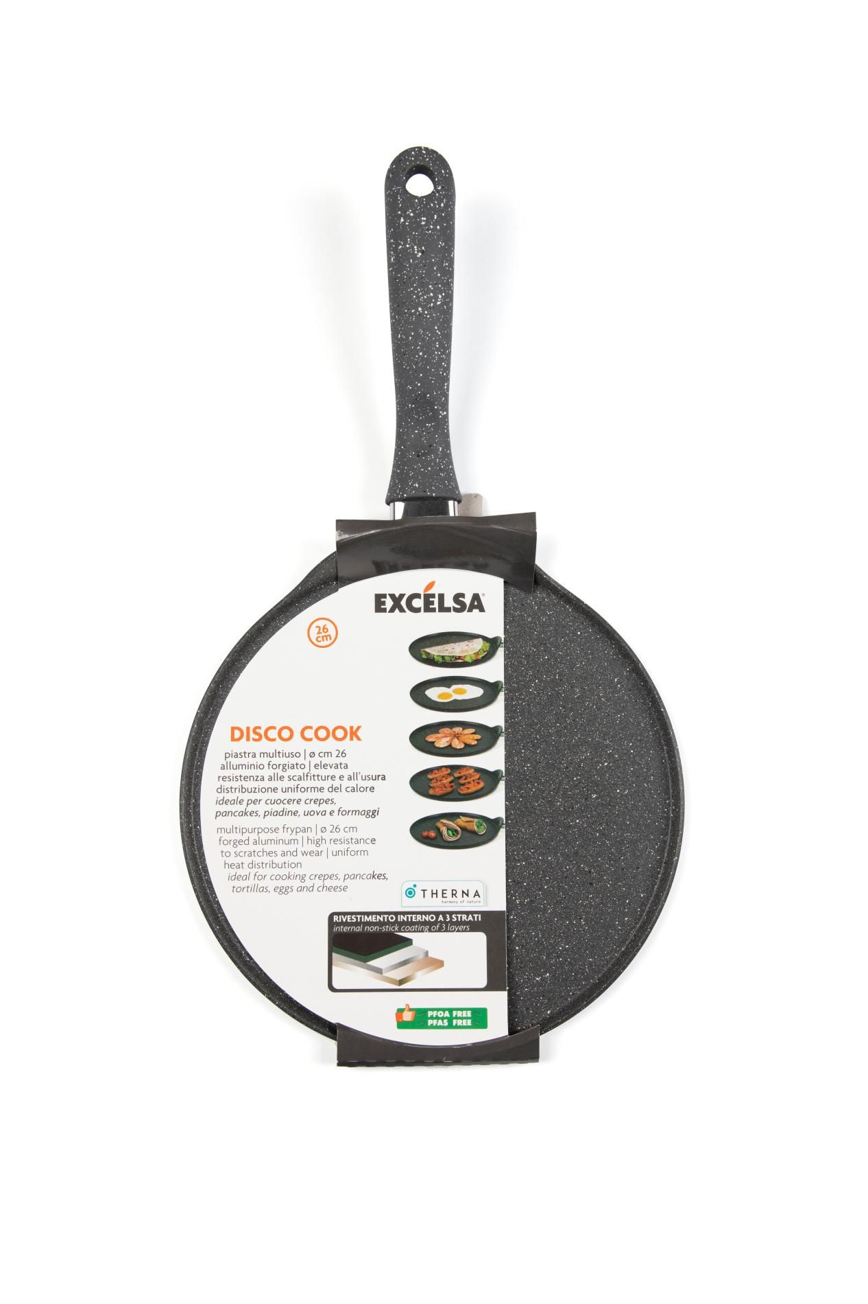 Disco Cook è la collezione di pentole e padelle tra cui la Piastra Multiuso, 26 cm di diametro con 1 manico.
