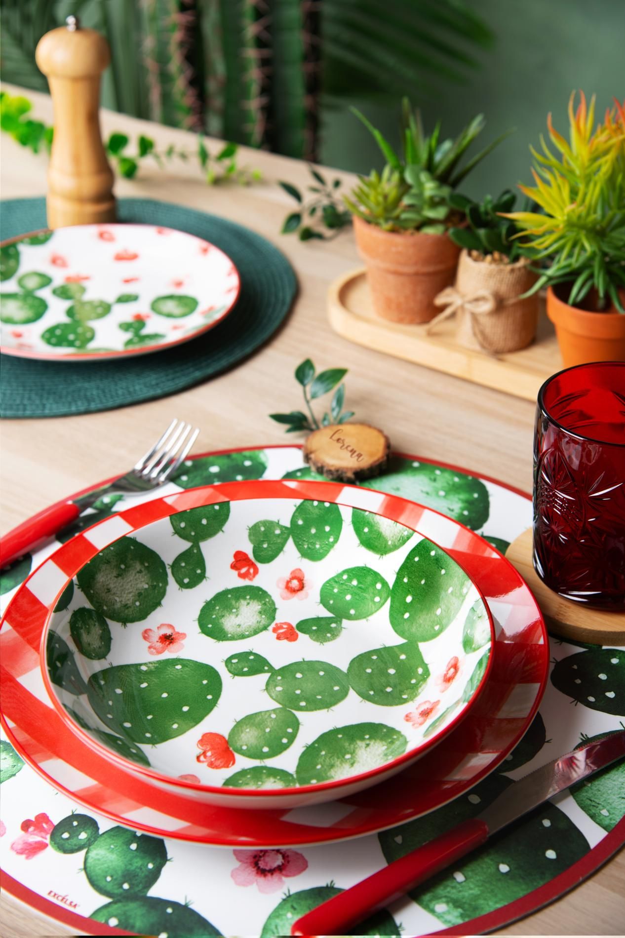 Con il servizio piatti Arizona di Excélsa ci siamo ispirati proprio al concetto di flora desertica e stile moderno. Nasce così un servizio piatti da 18 pezzi in porcellana con decorazione cactus e trama di tessuto simile alle tovaglie che si usano nei picnic.