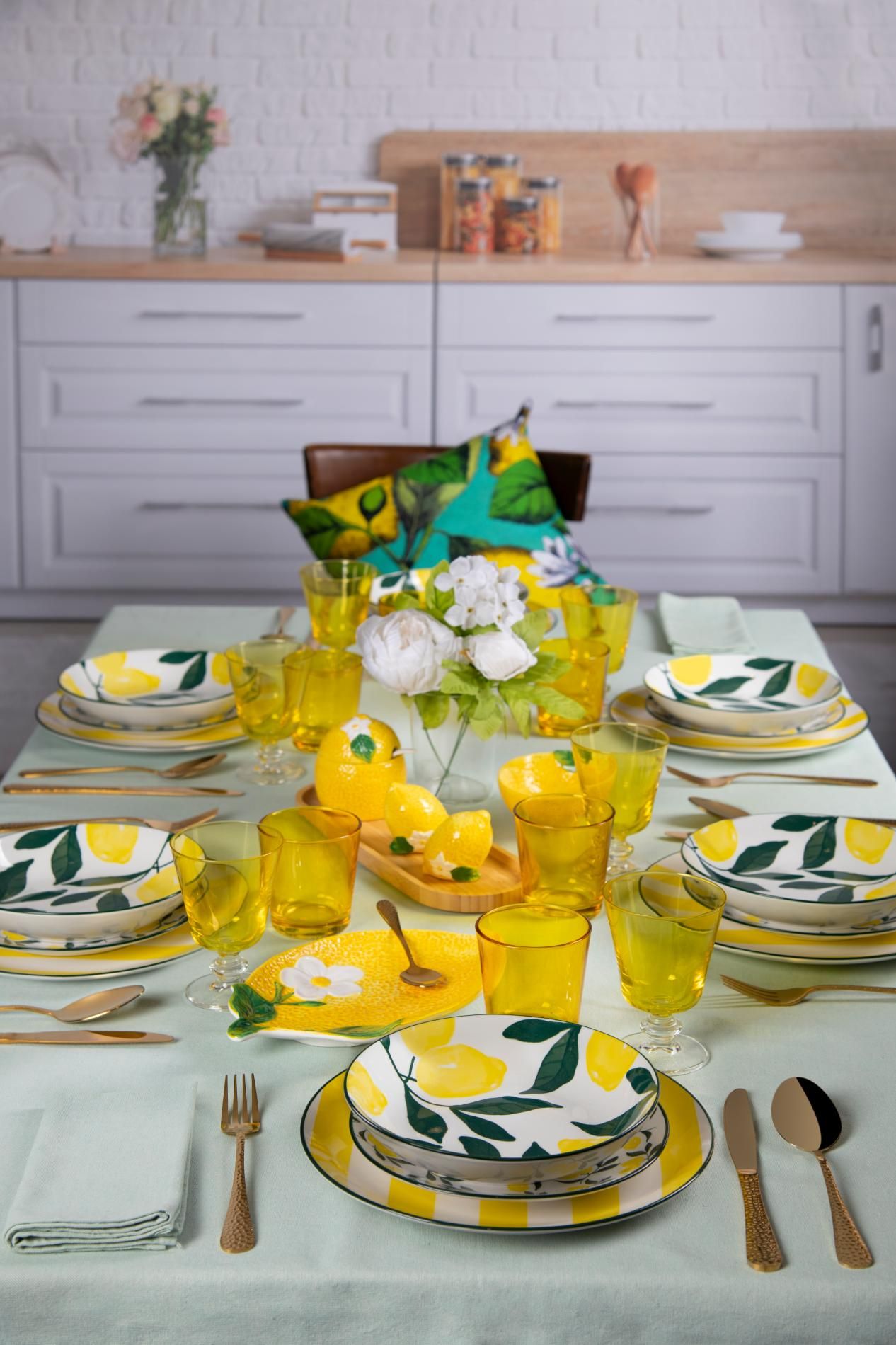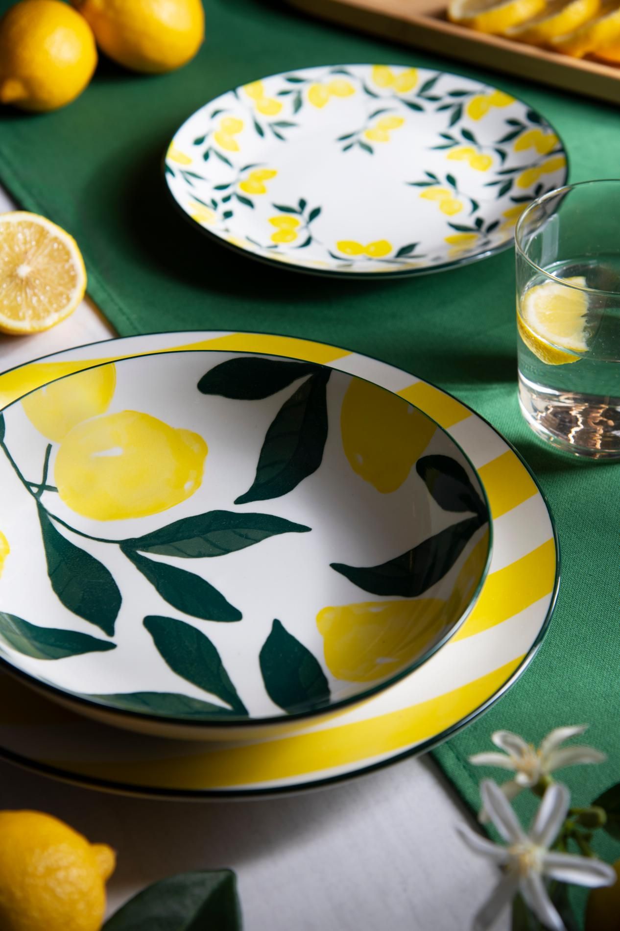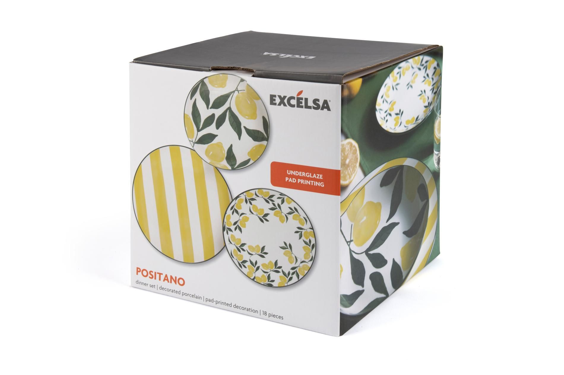 Con il servizio piatti Positano di Excélsa ci siamo ispirati allo stile mediterraneo moderno. Nasce così un servizio piatti da 18 pezzi in porcellana con decorazione limoni e righe alternate bianche e gialle.