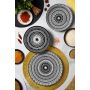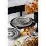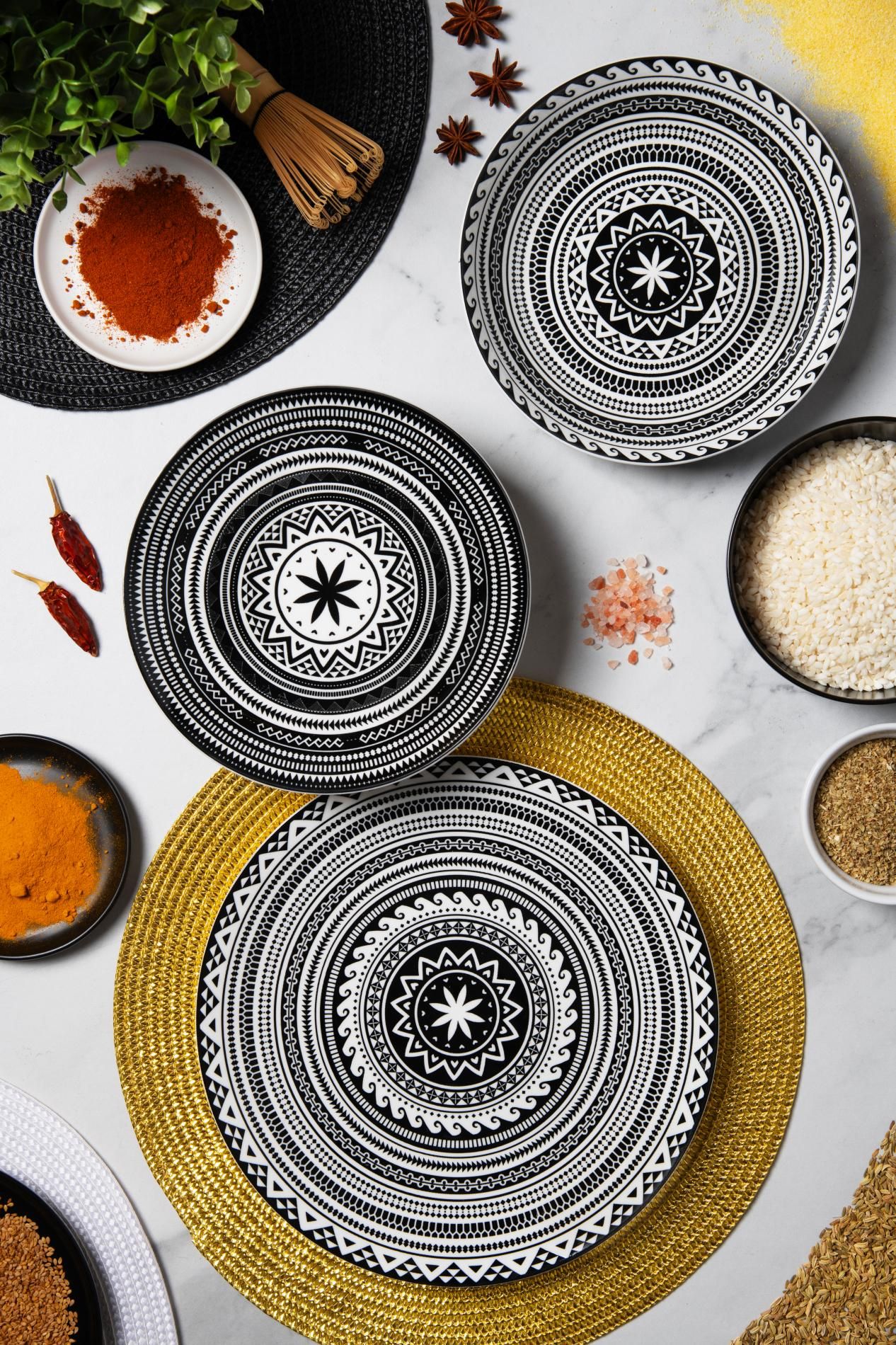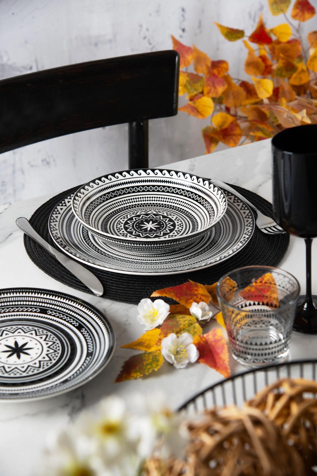La collezione di piatti Etnico di Excélsa è ideale per una tavola minimalista con un tocco di fantasie estratte geometriche di colore nero su fondo bianco.