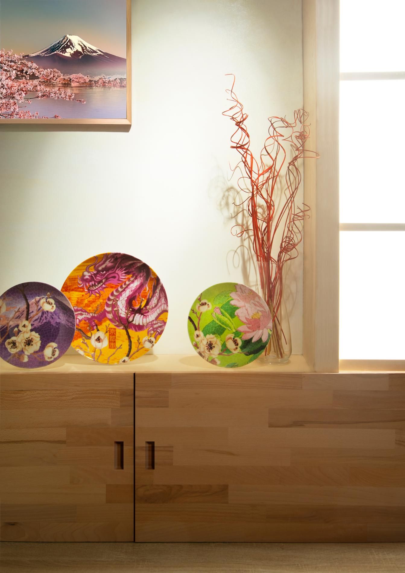 Caratterizzato da onde imponenti e infinite increspature d'acqua, la montagna sacra, satura di luce e di mistero, il fiore di loto candido e delicato e i rami di ciliegio dai petali rosa pallido, eleganti gru che volano verso il tramonto e temerarie carpe Koi che nuotano controcorrente, draghi leggendari, messaggeri del destino e augurio di buona sorte, il servizio piatti Fuji di Excélsa è un'opera d'arte che celebra la cultura giapponese.