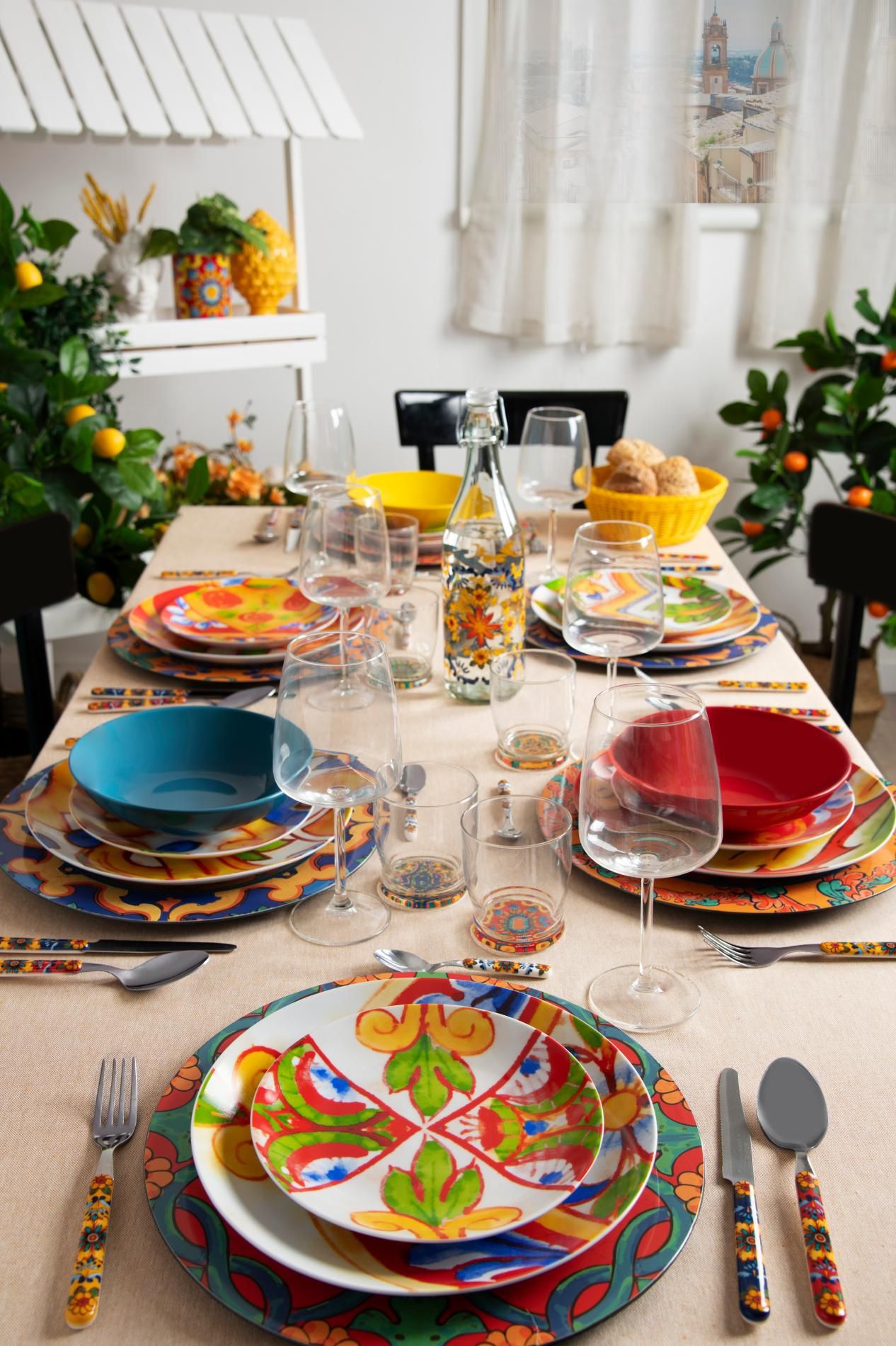 I piatti piani e quelli dessert/frutta sono decorati con la texture Caltagirone. I piatti fondi sono monocolore, rispettivamente: 2 gialli, 2 rossi, 2 azzurri.