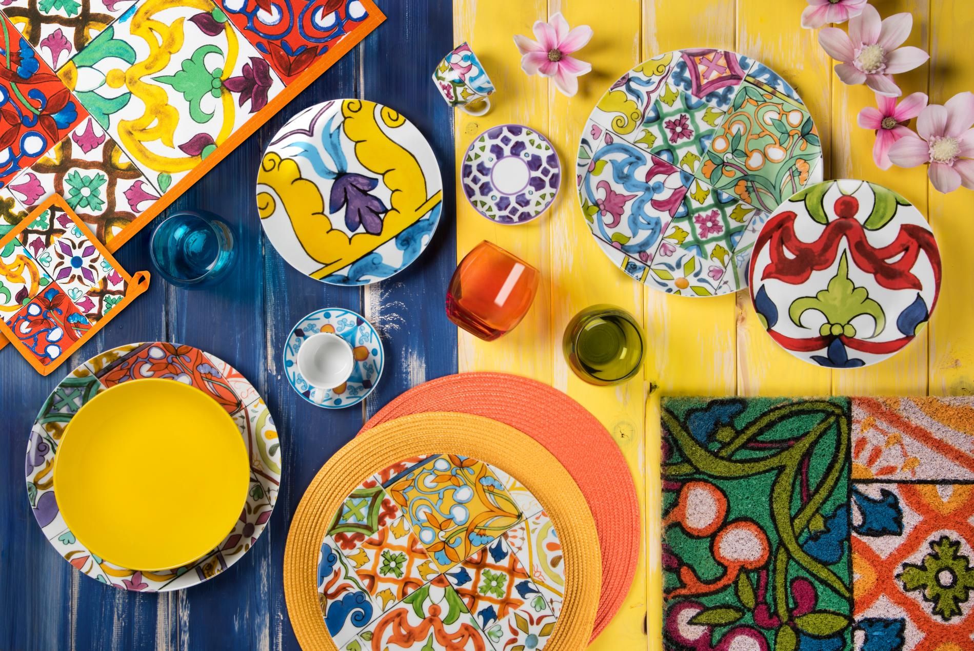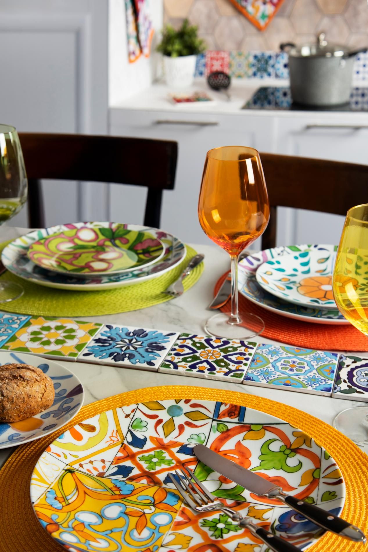 Fantasie similari agli azulejos portoghesi, ma ricchi di colore per collezione di piatti Lisbona di Excélsa! Che tu decida di servire cucina italiana oppure un bacalhau, delle sardinhas o delle pasteis de Nata siamo sicuri che il servizio di piatti Lisbona sarà un successo sulla tua tavola.