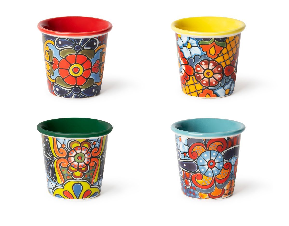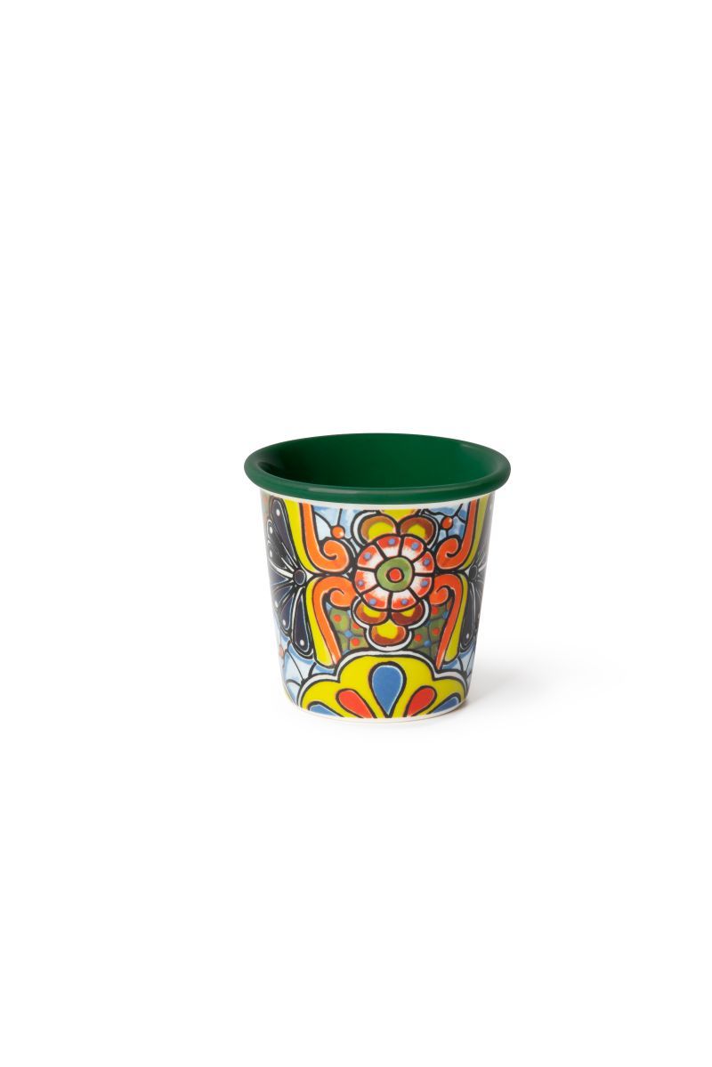 I decori coloratissimi riprendono quelli dell'omonima collezione. Ogni bicchierino ha una personalizzazione di decoro ed un interno in tinta piatta differente.