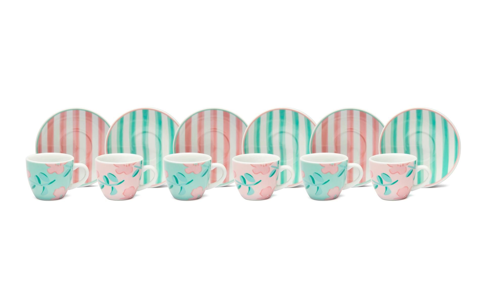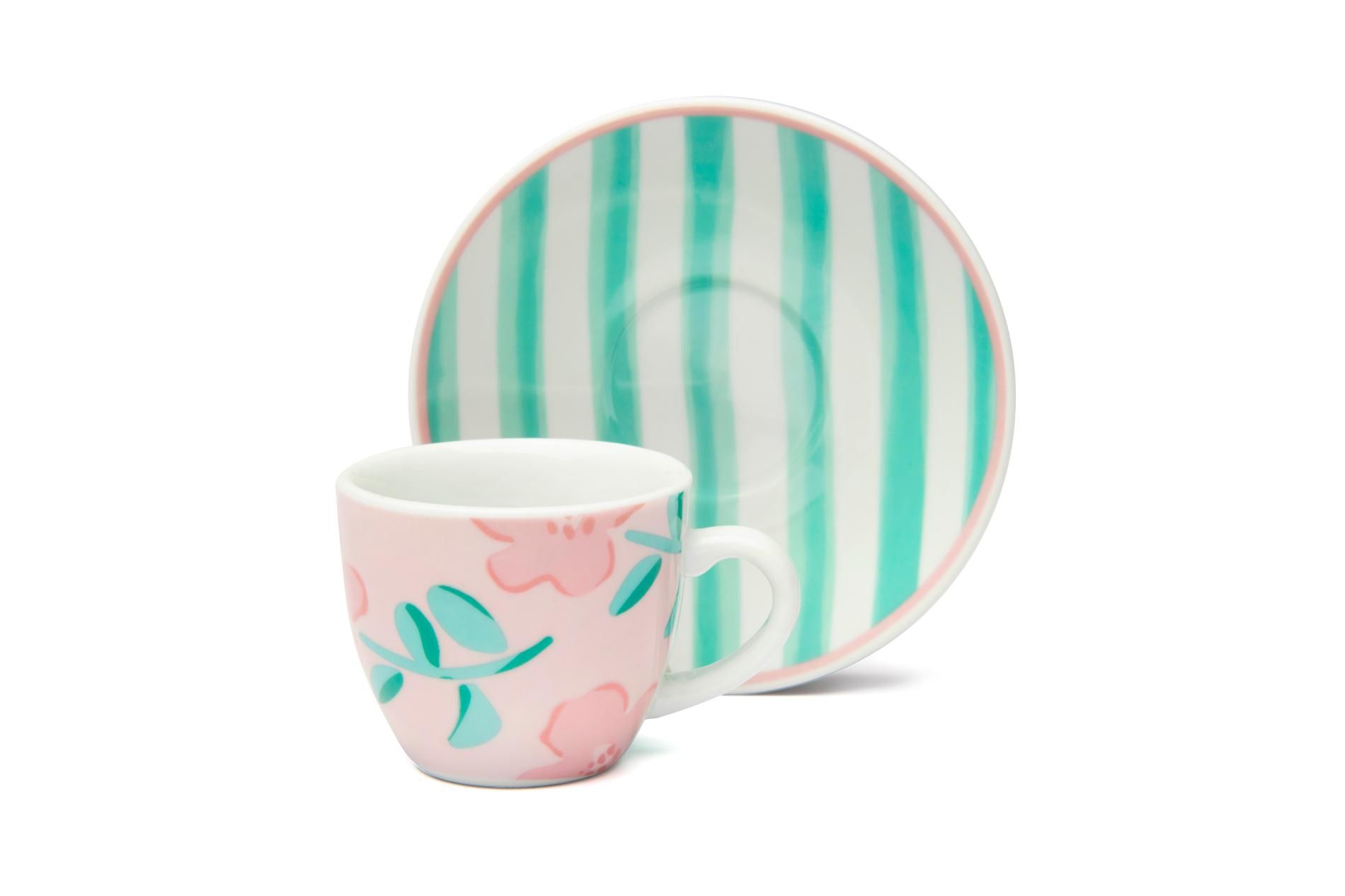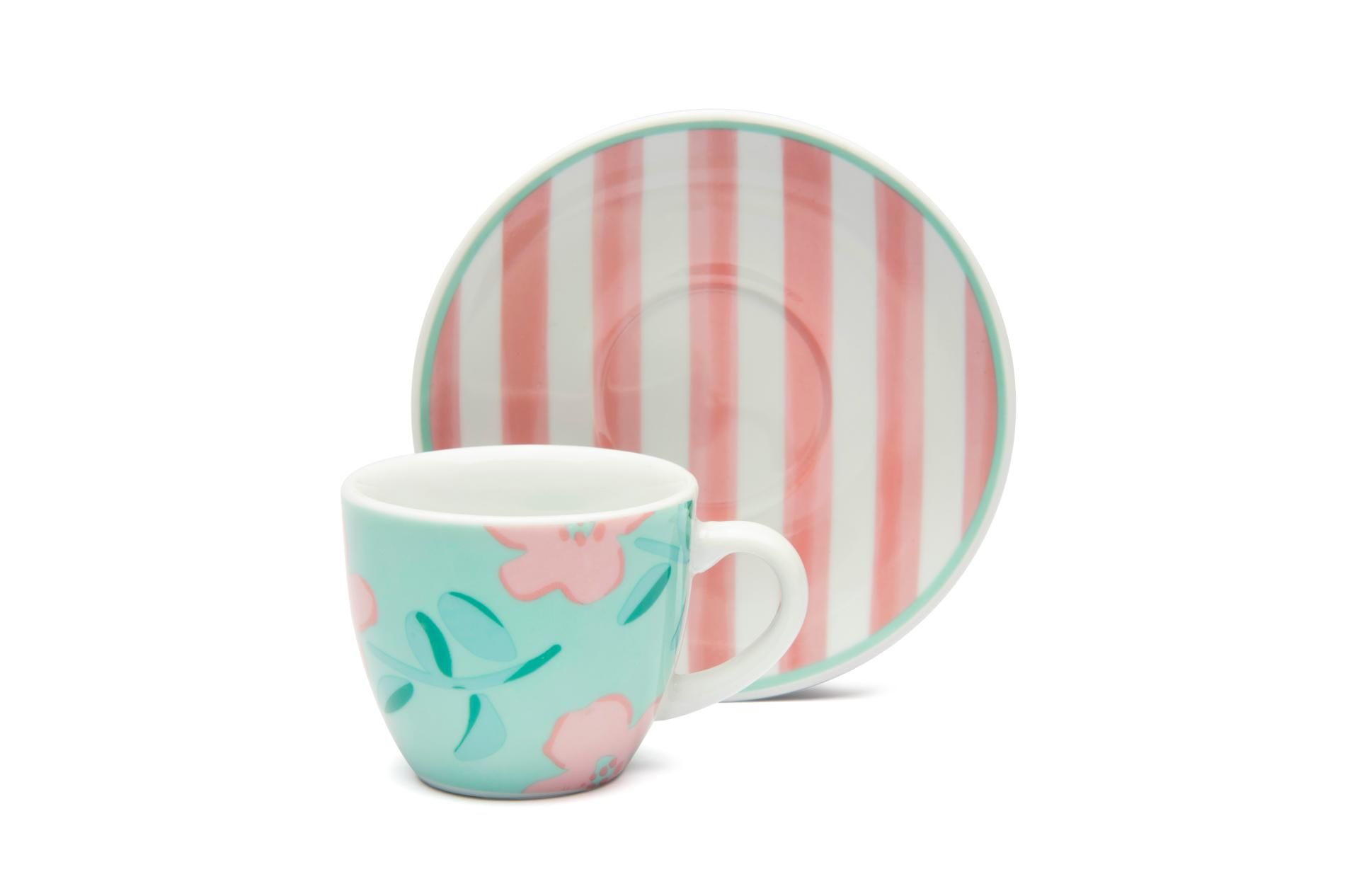 Le tazzine per caffè espresso Primula di Excélsa sono vendute in set da 6 pezzi e riprendono la fantasia multicolore che caratterizza questa collezione dai tratti floreali e freschi.