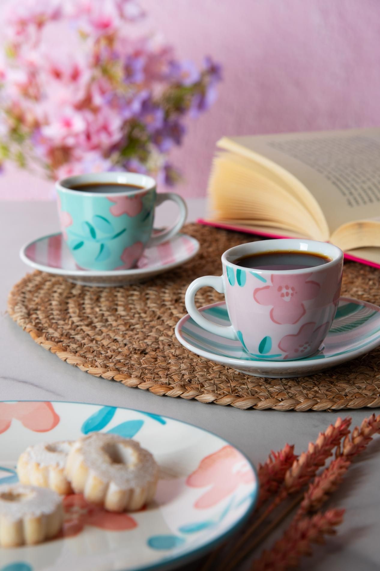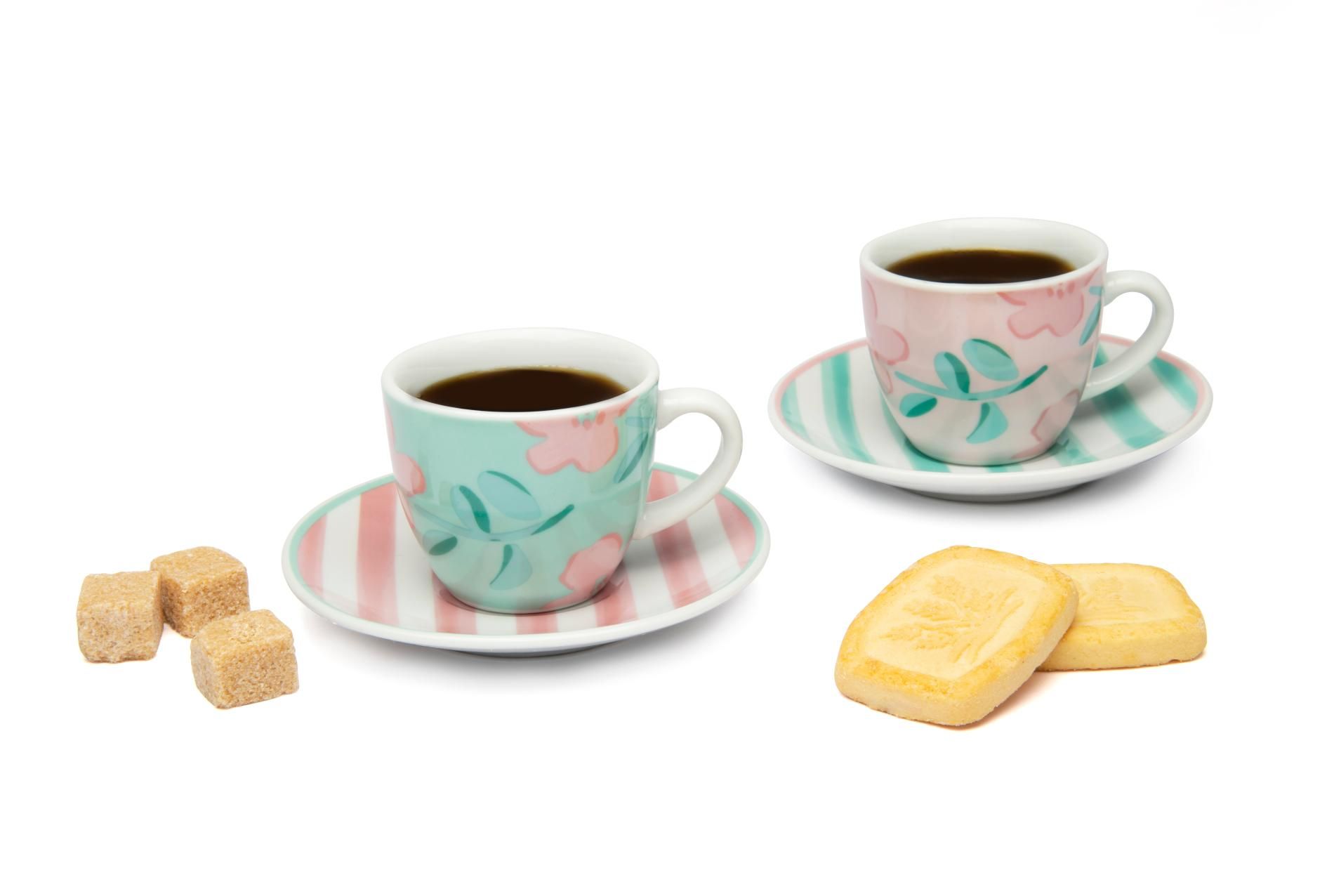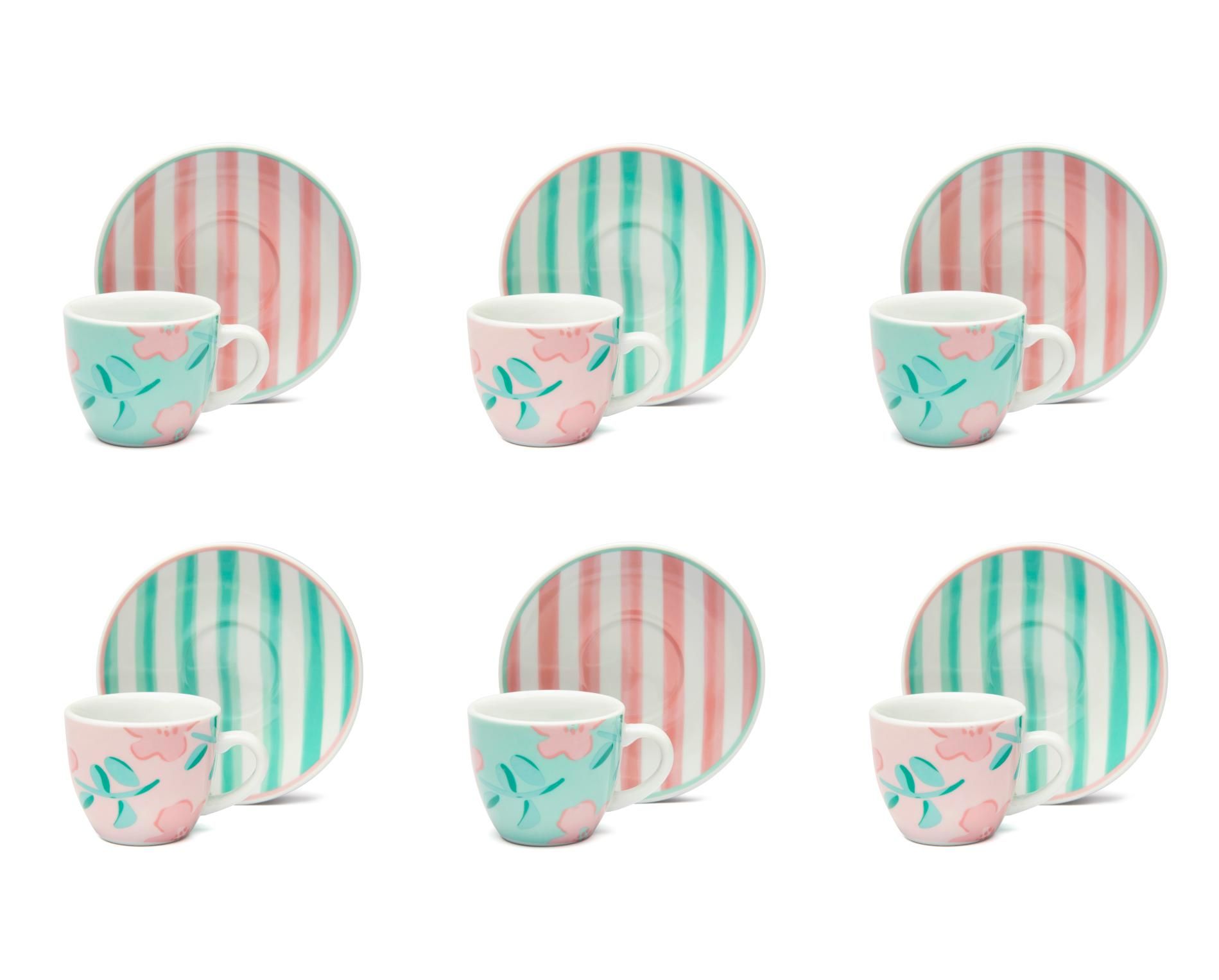 Le tazzine per caffè espresso Primula di Excélsa sono vendute in set da 6 pezzi e riprendono la fantasia multicolore che caratterizza questa collezione dai tratti floreali e freschi.