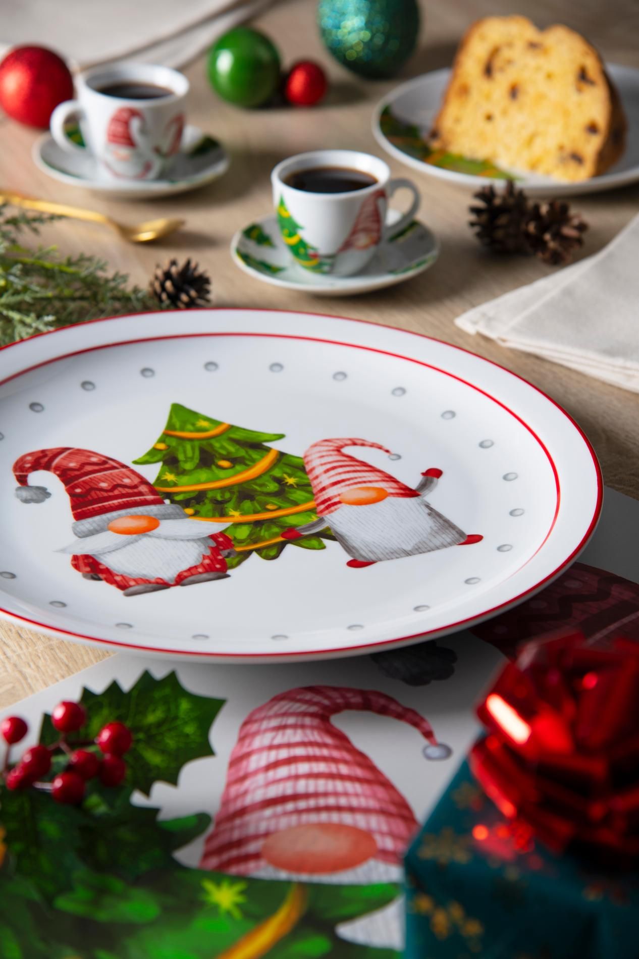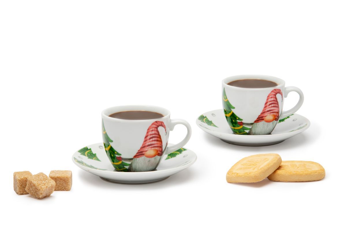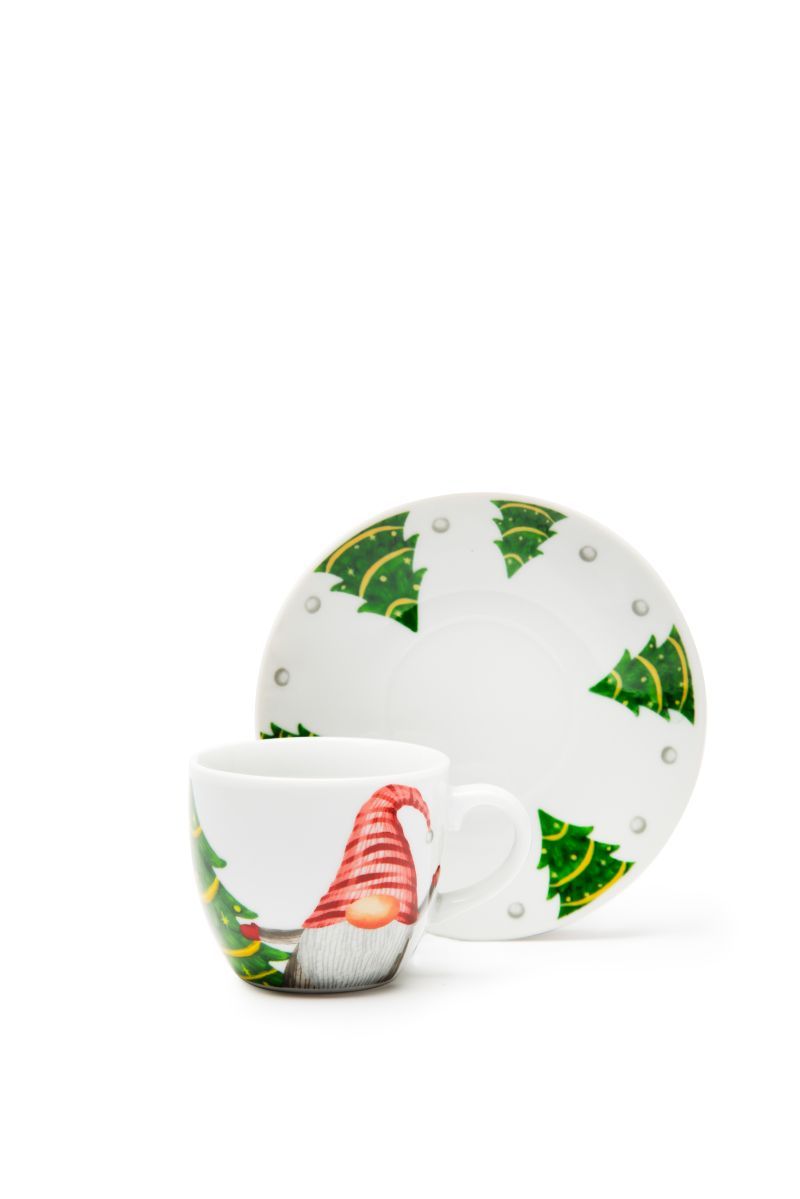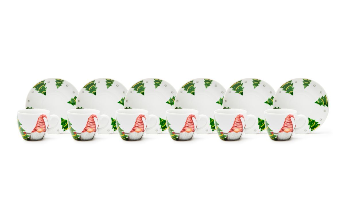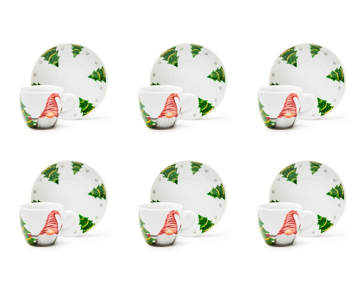 Le tazzine per caffè espresso, con piattino incluso, Gnomo Friends di Excélsa sono vendute in set da 6 pezzi e riprendono la fantasia con gnomi e abeti che caratterizza questa simpatica collezione.