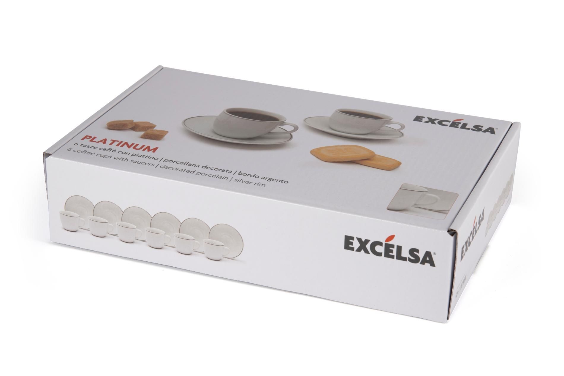 Le tazzine per caffè espresso Platinum di Excélsa sono vendute in set da 6 pezzi con piattino incluso. Sia tazzina che piattino sono in porcellana bianca con filo argentato per uno stile classico, senza tempo.