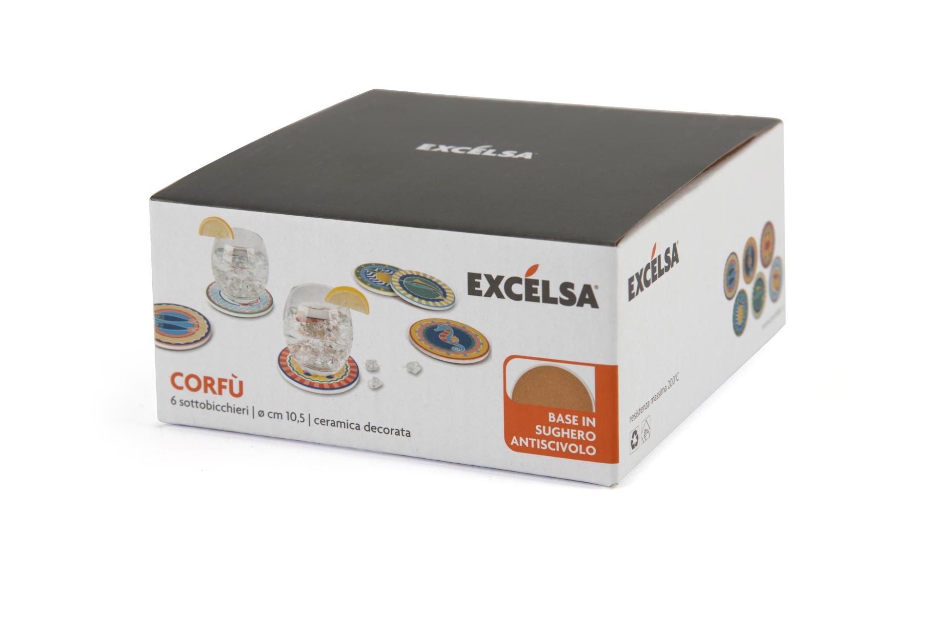 Il set da 6 pezzi di sottobicchieri Corfù di Excélsa è il dettaglio per la tua tavola che può fare davvero la differenza. Ogni pezzo, in ceramica, può essere appoggiato sotto ad ogni bicchiere per proteggere la tovaglia da possibili macchie di vino o acqua. Ogni sottobicchiere ha una decorazione diversa in stile marinaro rendendo così diversificato ogni posto tavola. Il diametro è di 10,5 cm cadauno.