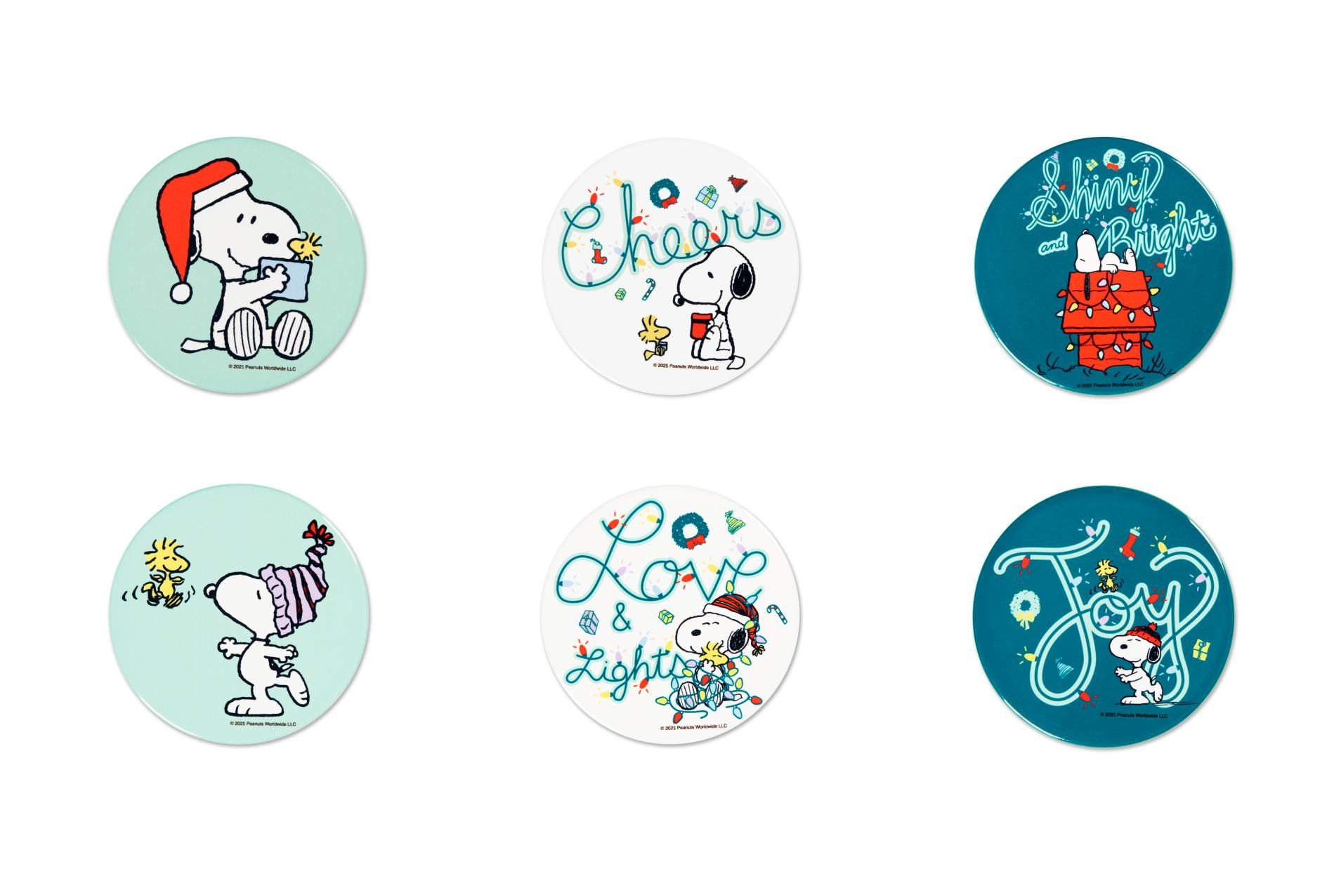 I sottobicchieri della serie Peanuts Shiny & Bright di Excélsa sono venduti in set da 6. Ogni sottobicchiere è personalizzato con un personaggio e una grafica differenti. Snoopy e Woodstock alle prese con i preparativi per il Natale e le festività.