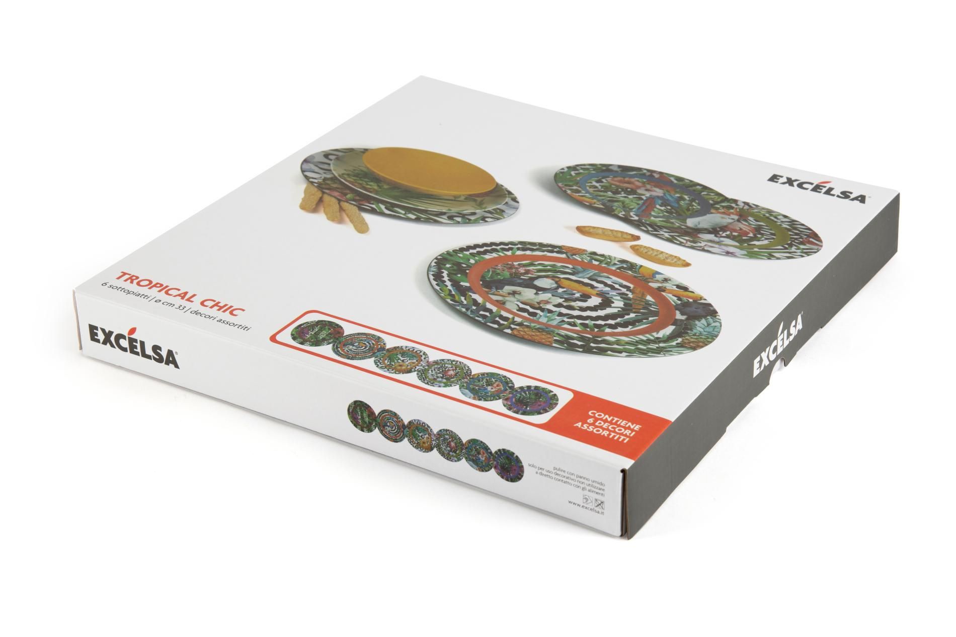 I sottopiatti sono confezionati in scatola litografata. Ogni sottopiatto misura 33 cm di diametro. Il sottopiatto non può sostituire il piatto e non deve essere messo a contatto diretto con il cibo.