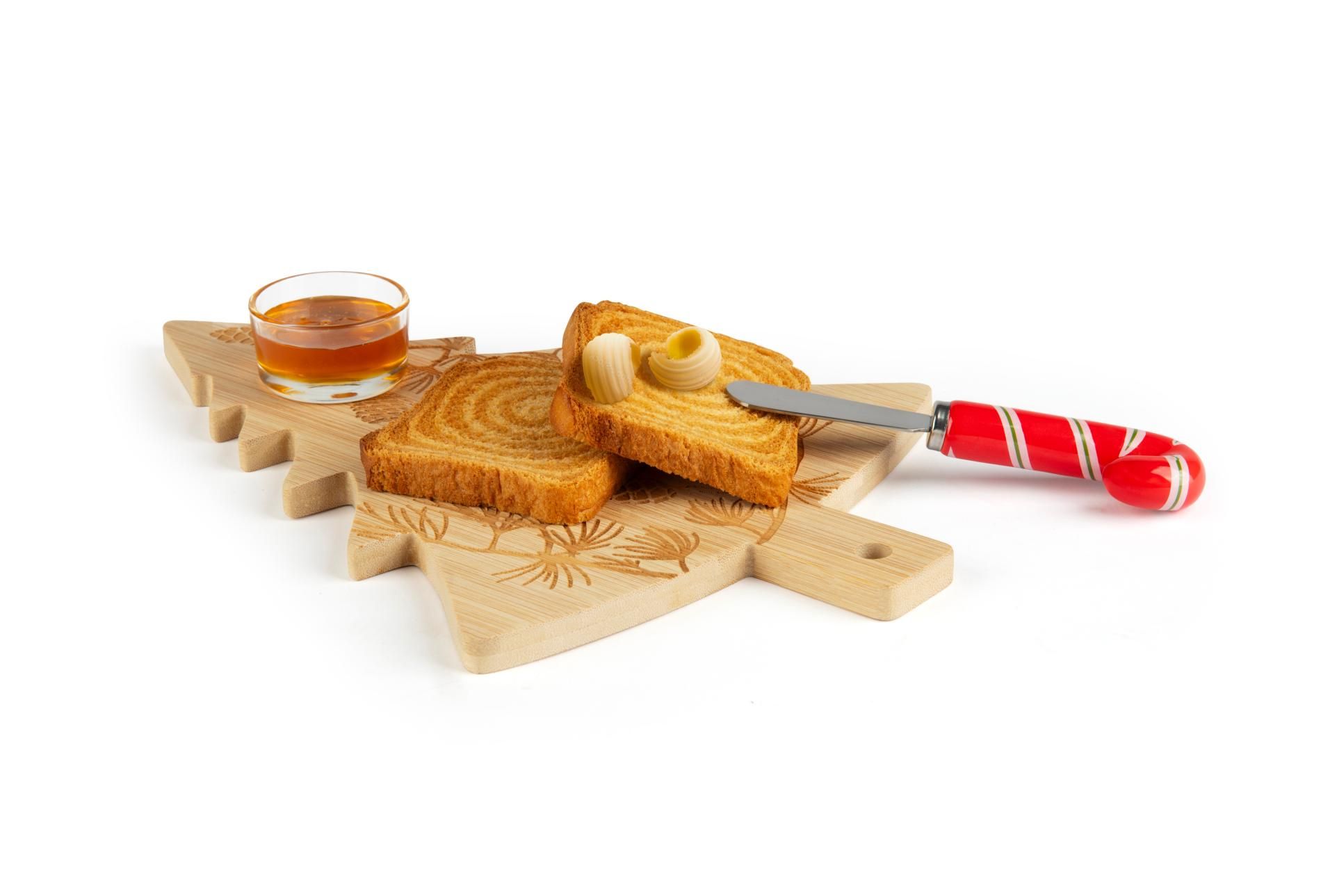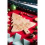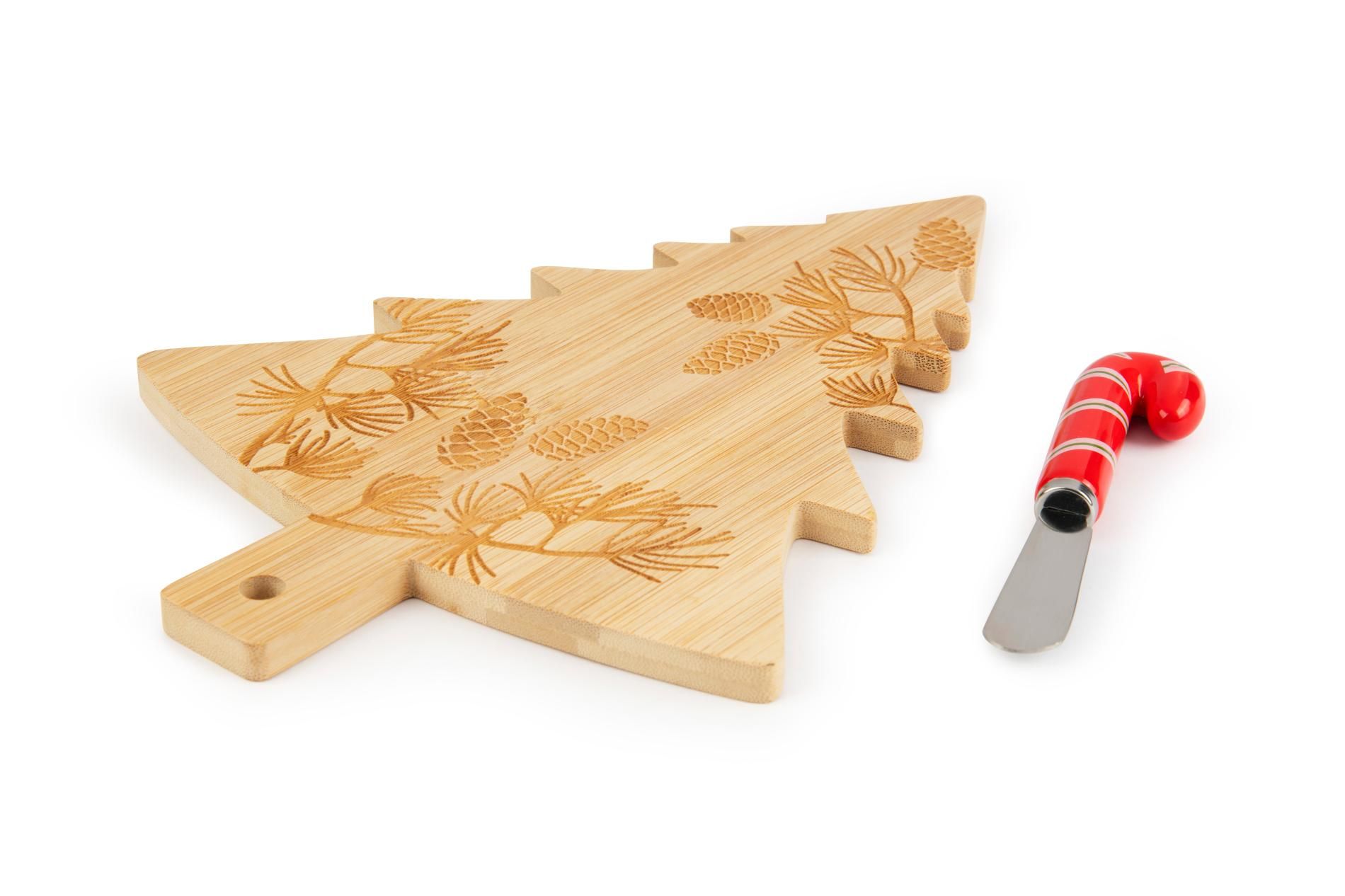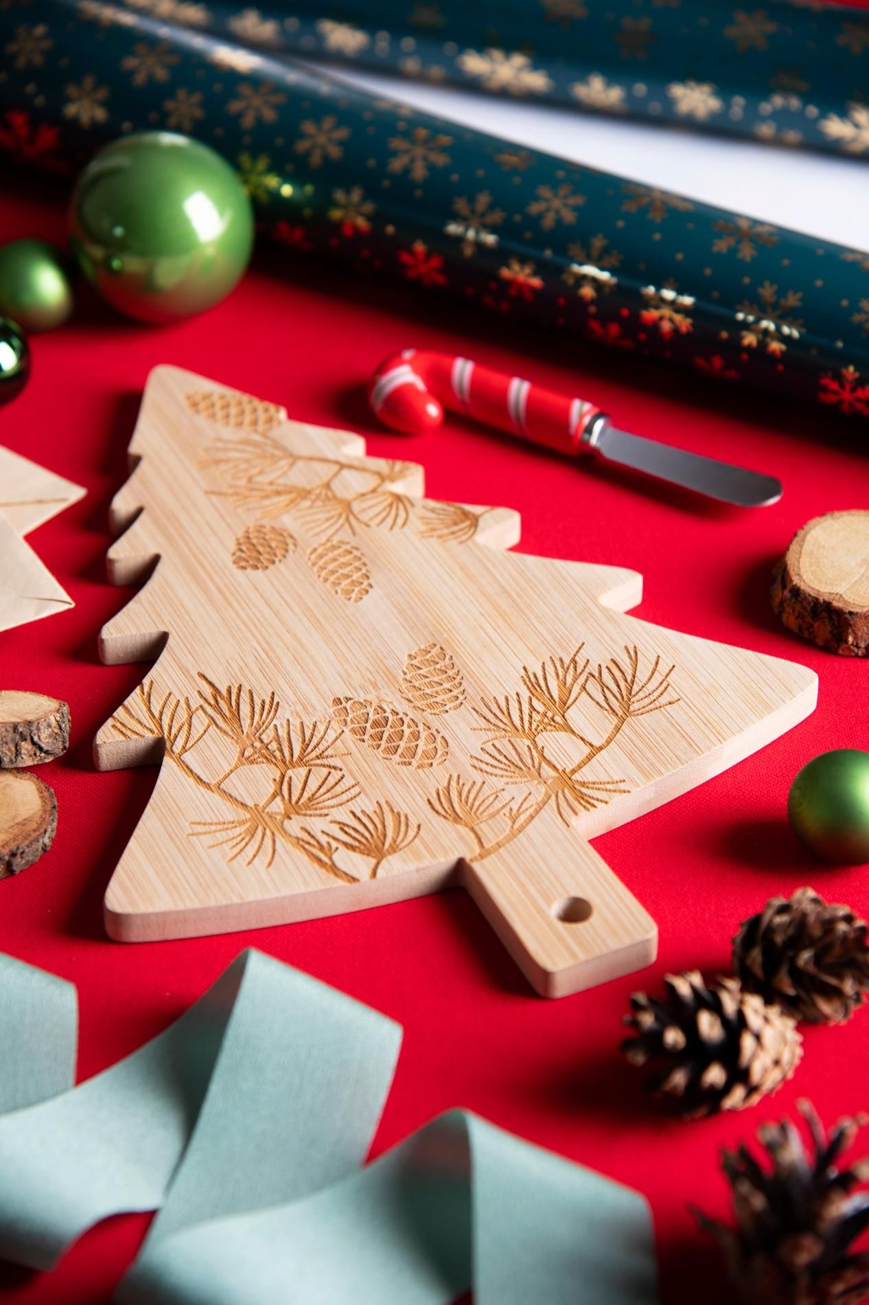 Il tagliere a servire è a forma di albero di Natale con foro per appenderia, decorazione sul legno che riprende gli aghi e le pigne dell'abete vero. Il materiale da cui è stato ricavato il tagliere è bambù.