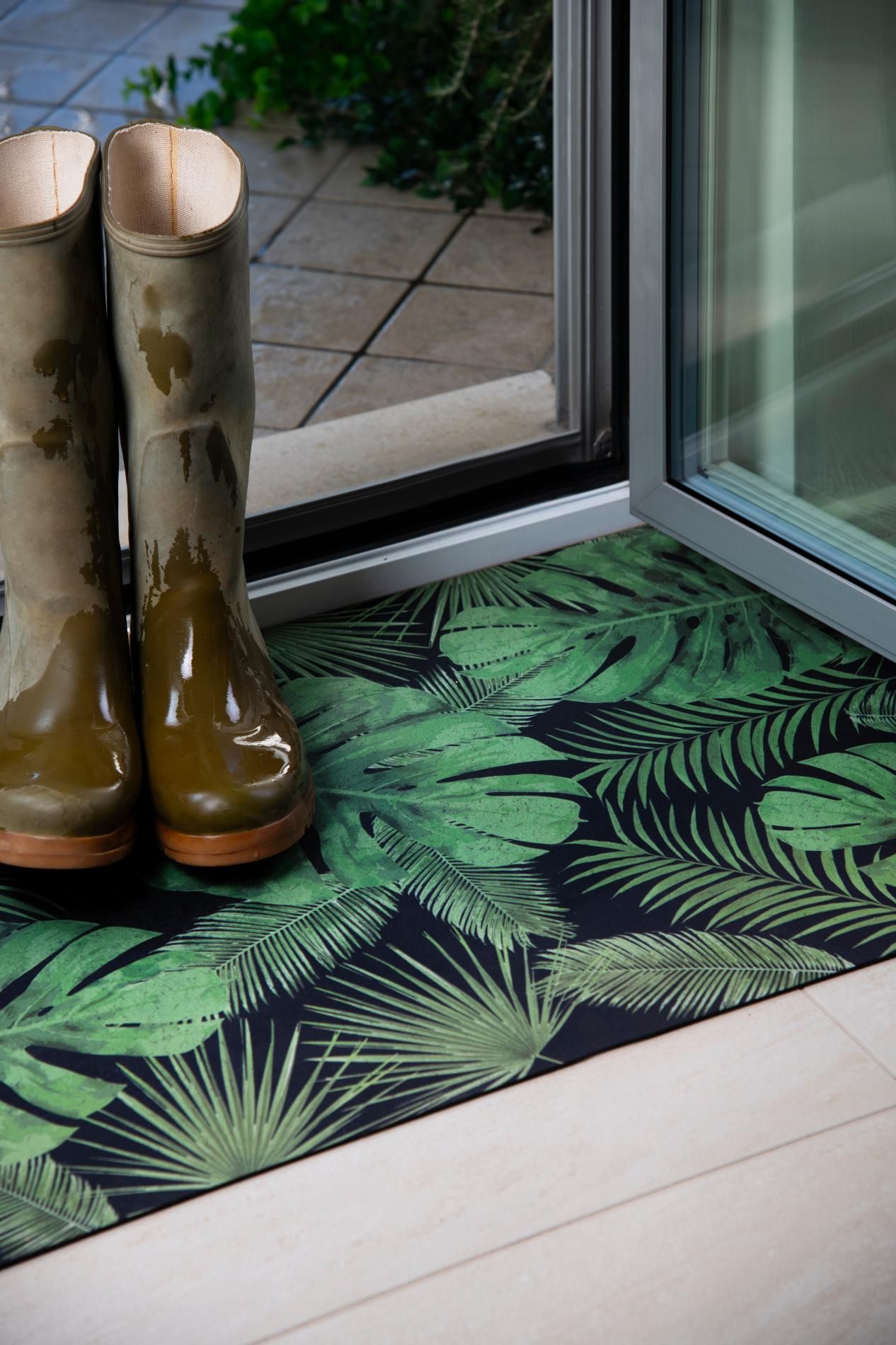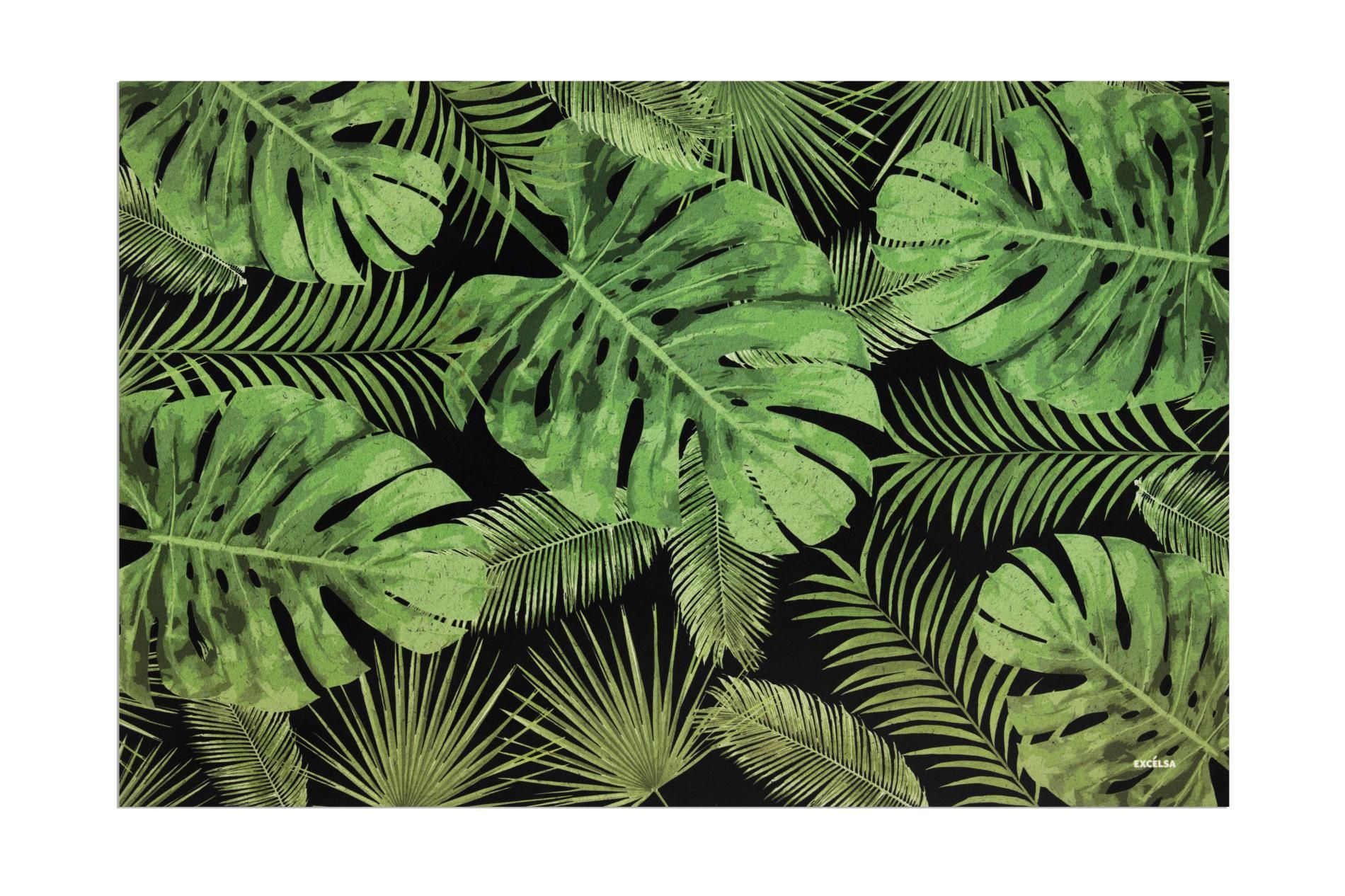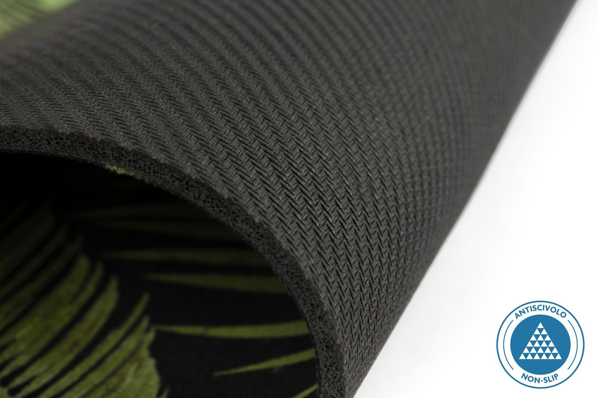 Verdissimo e coordinabile con gli altri prodotti della collezione Foliage, il tappeto è prodotto in gomma naturale ed è soffice al tatto. La sua superficie è rivestita con tessuto poliestere stampato in digitale per garantire la massima brillantezza dei colori.