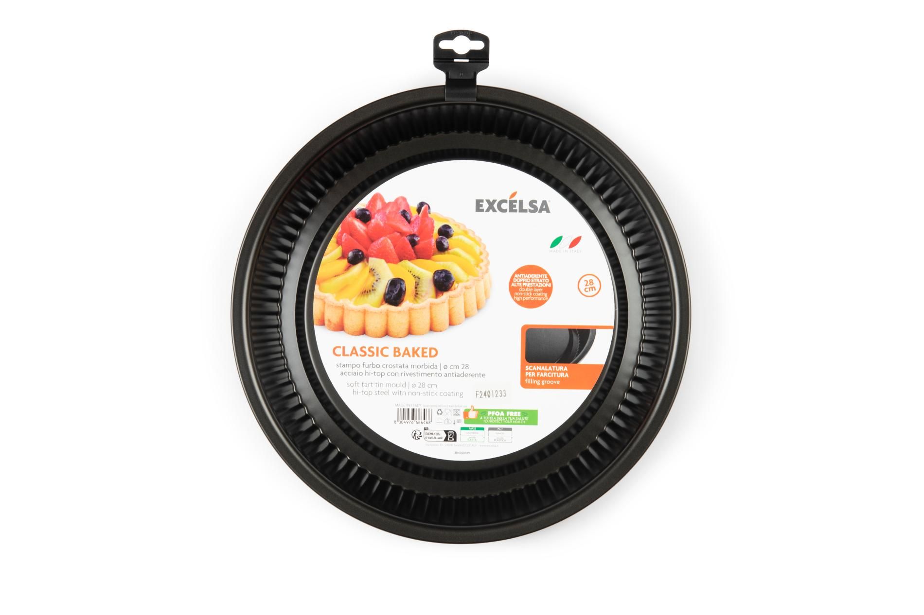 Di dimensioni generose, di forma tonda, la teglia diametro 28 cm è perfetta per la cottura delle crostate. Il bordo infatti ha una forma plissettata che conferisce alla frolla in cottura un piacevole effetto estetico.
