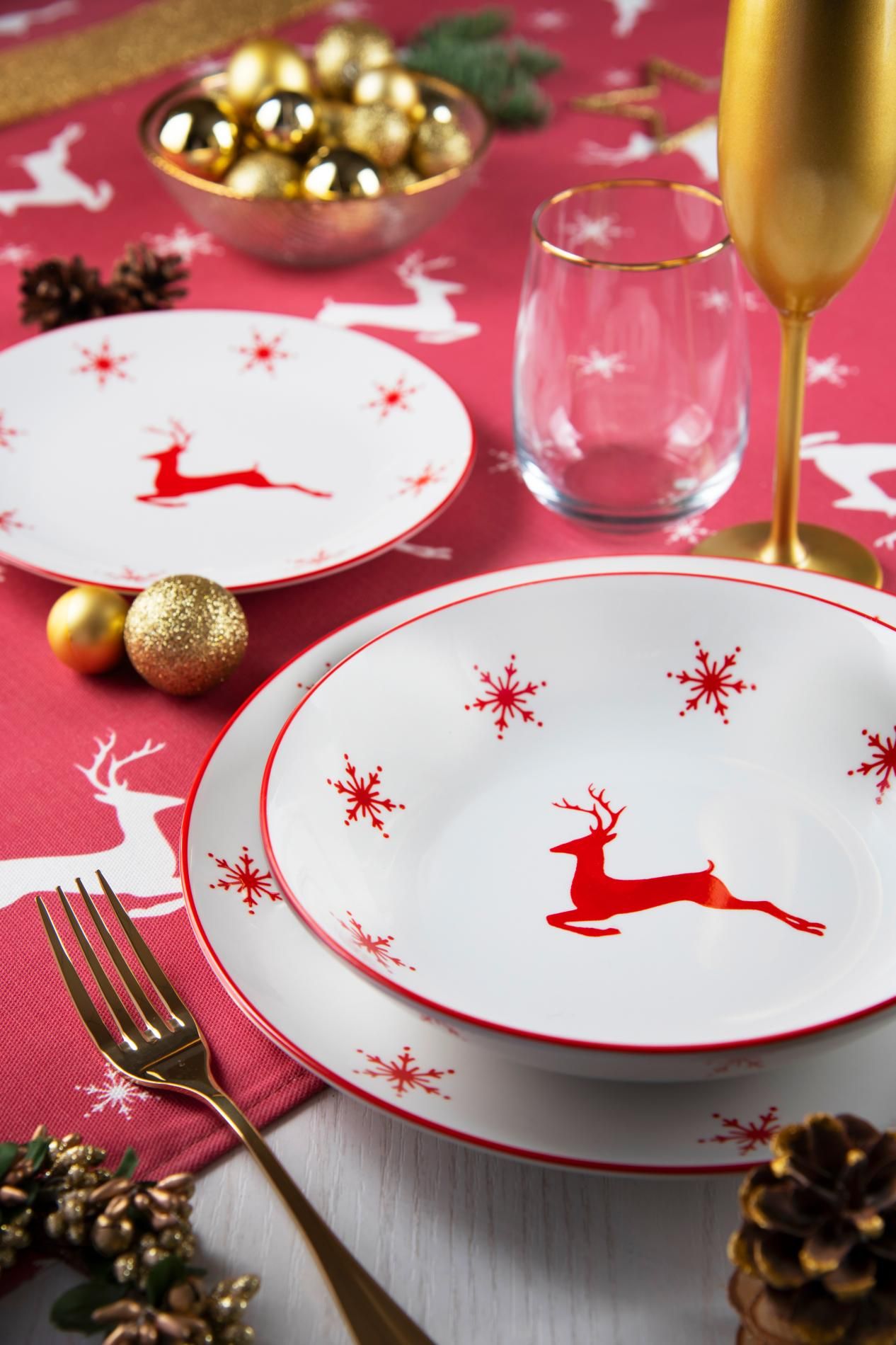 L'atmosfera deve essere conviale e allegra. Quale miglior occasione di sfoggiare sulla tavola natalizia la tovaglia Nordic Christmas? Fondo rosso e piccole dolcissime renne in bianco che sembrano fluttuare sul tessuto.